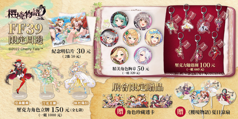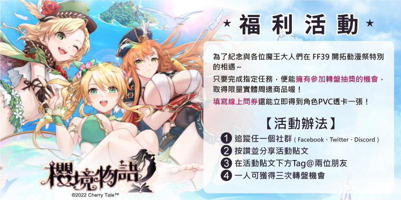 《櫻境物語》為了與大家一起歡度這場動漫盛會,安排了展會兩日限定的紀念周邊轉盤活動。只要加入官方社群,分享活動貼文並在下方留言 TAG 好友,即可獲得幸運轉盤機會,多款周邊免費送。現場除了幸運轉盤供玩家同樂外,展會期間玩家填寫回饋問卷還能立即獲得 FF 限定角色珍藏透卡。