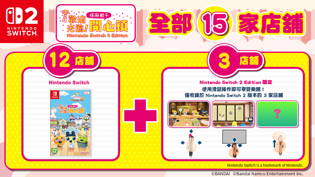 在 Nintendo Switch 2 版的《歡迎光臨!塔麻歌子開心鎮 Nintendo Switch 2 Edition》中,新增能以滑鼠操作遊玩的 3 種店家,共收錄 15 種店家。店家評價越好,店面就會變得更大,還會有新的塔麻歌子前來光顧。