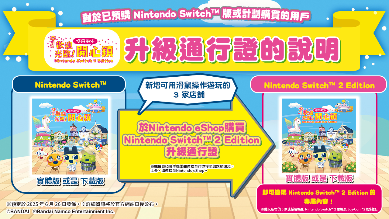 萬代南夢宮娛樂宣布,Nintendo Switch 2 版專用實體版遊戲片《歡迎光臨!塔麻歌子開心鎮 Nintendo Switch 2 Edition》即將在 7 月 10 日正式發售。Nintendo Switch 版實體版遊戲片則將於 6 月 26 日發售。