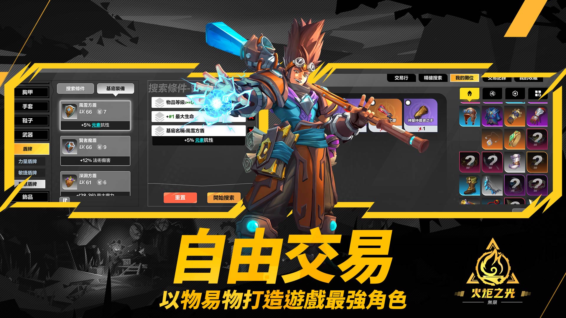 在《火炬之光:無限》中幾乎可以販售所有的裝備以及道具材料,遊戲沒有常見的「金幣」貨幣設定,取而代之的各式各樣的通貨道具,玩家們可以將想要販售的裝備,設定符合自身需求的通貨價值,並上架於交易行上,即可完成商品上架。交易行也擁有便利的道具搜尋功能,快速找出最適合的裝備。在《火炬之光:無限》裡,可能對自己來說廢品裝備,在他人眼中就是無上價值的神裝。積極使用交易功能來提升角色的能力,更能有效率的擊倒強敵。