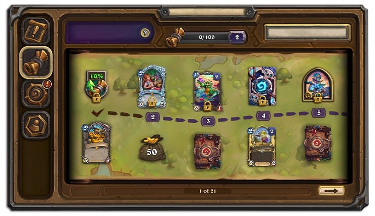 《天堂島危機》旅店貴賓證(台幣 600 元):立刻獲得 10% 經驗值獎勵以及截至目前等級為止付費版獎勵軌跡的全部內容物。還有詹莉.伊夏鑽石傳說卡、經理馬林黃金傳說卡牌、戈貢佐姆黃金傳說卡牌、兩張黃金史詩卡牌、兩張史詩珍藏卡牌、兩張精良珍藏卡牌、兩張普通珍藏卡牌、11 款全新的《天堂島危機》主題《爐石戰記》造型、一種卡背、一種全新的造型幸運幣,以及兩包黃金標準規則卡牌包。