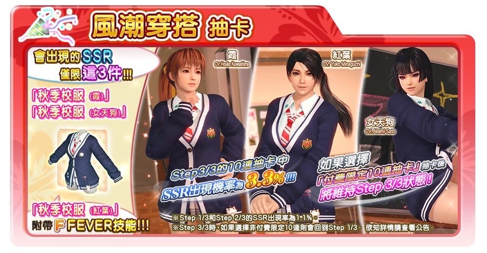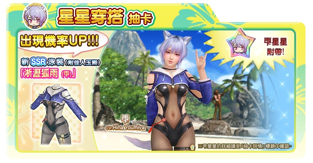 「雫」可以在「星星穿搭抽卡」中,獲得新 SSR 泳裝「浙瀝狐雨」後招待至島上。使用付費 V 心石抽卡將可額外獲得「雫星星」,只要收集 200 個「雫星星」即可兌換一套「雫」專用 SSR 泳裝。「雫登場紀念活動」正舉辦可以最多獲得 5000 個免費 V 心石等豪華道具的登入獎勵活動。