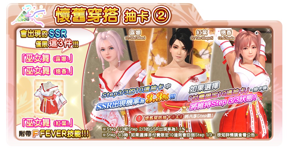 此外,也舉辦了可以獲得正適合新年試手運的「神籤棒」登入獎勵活動。每天贈送 1 個或 2 個「神籤棒」(最多 7 天),有機會獲得最多 10000 個免費 V 心石,「風潮穿搭抽卡」中,「筑紫」、「蒂娜」、「香蒂」等女孩的 SSR 泳裝「巫女舞」登場。是正適合新年的應景泳裝,也請務必參考看看。