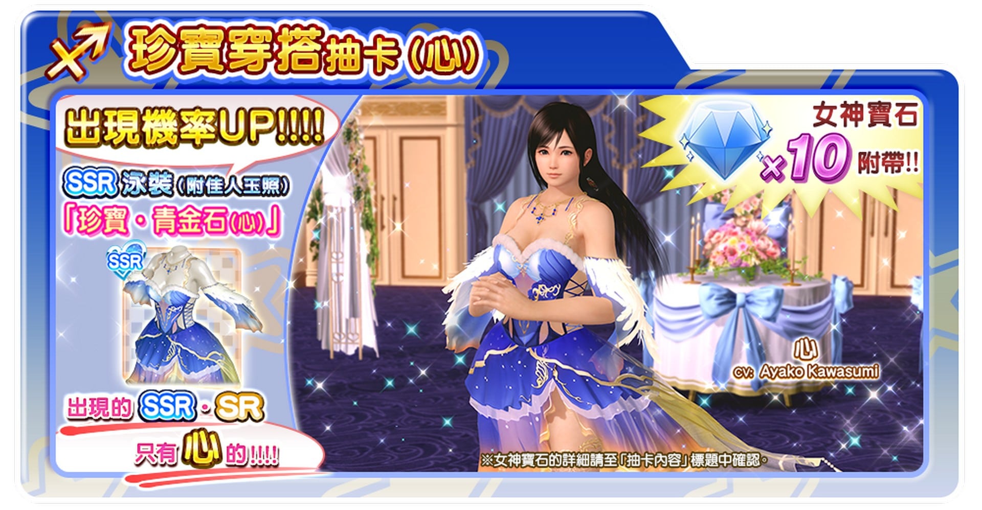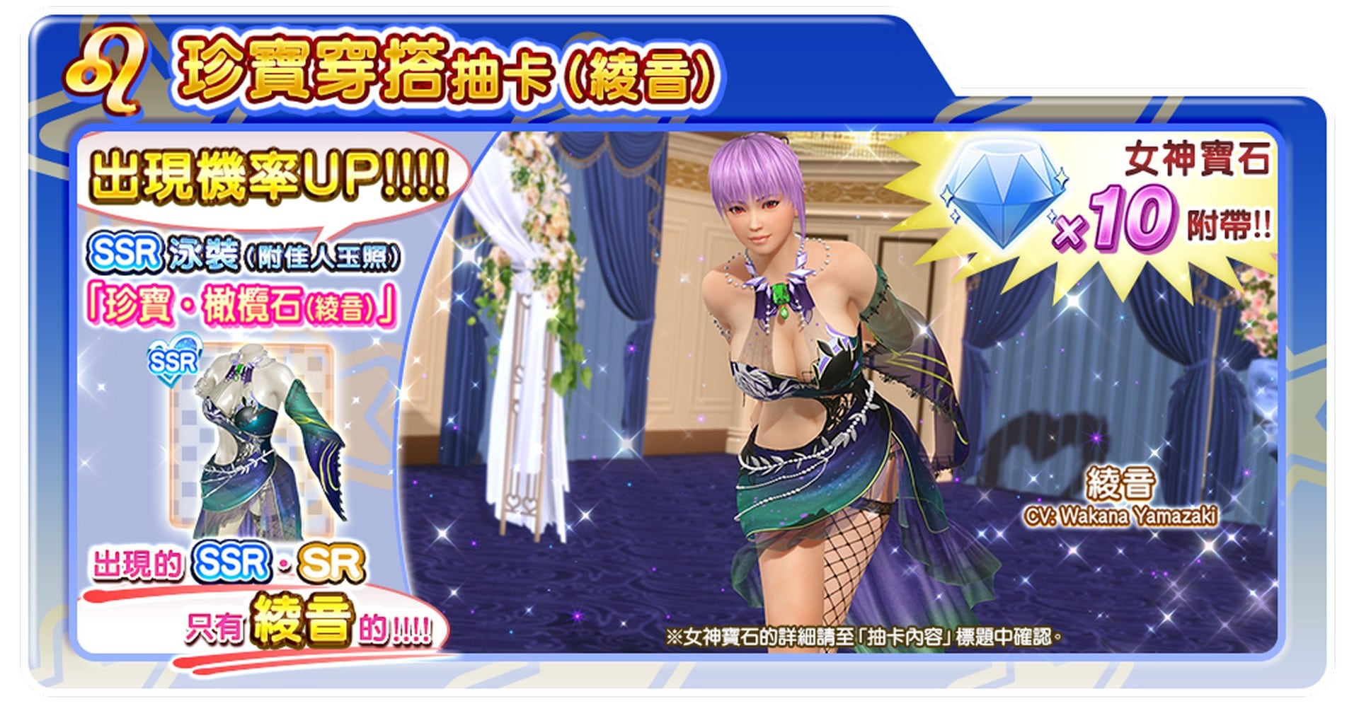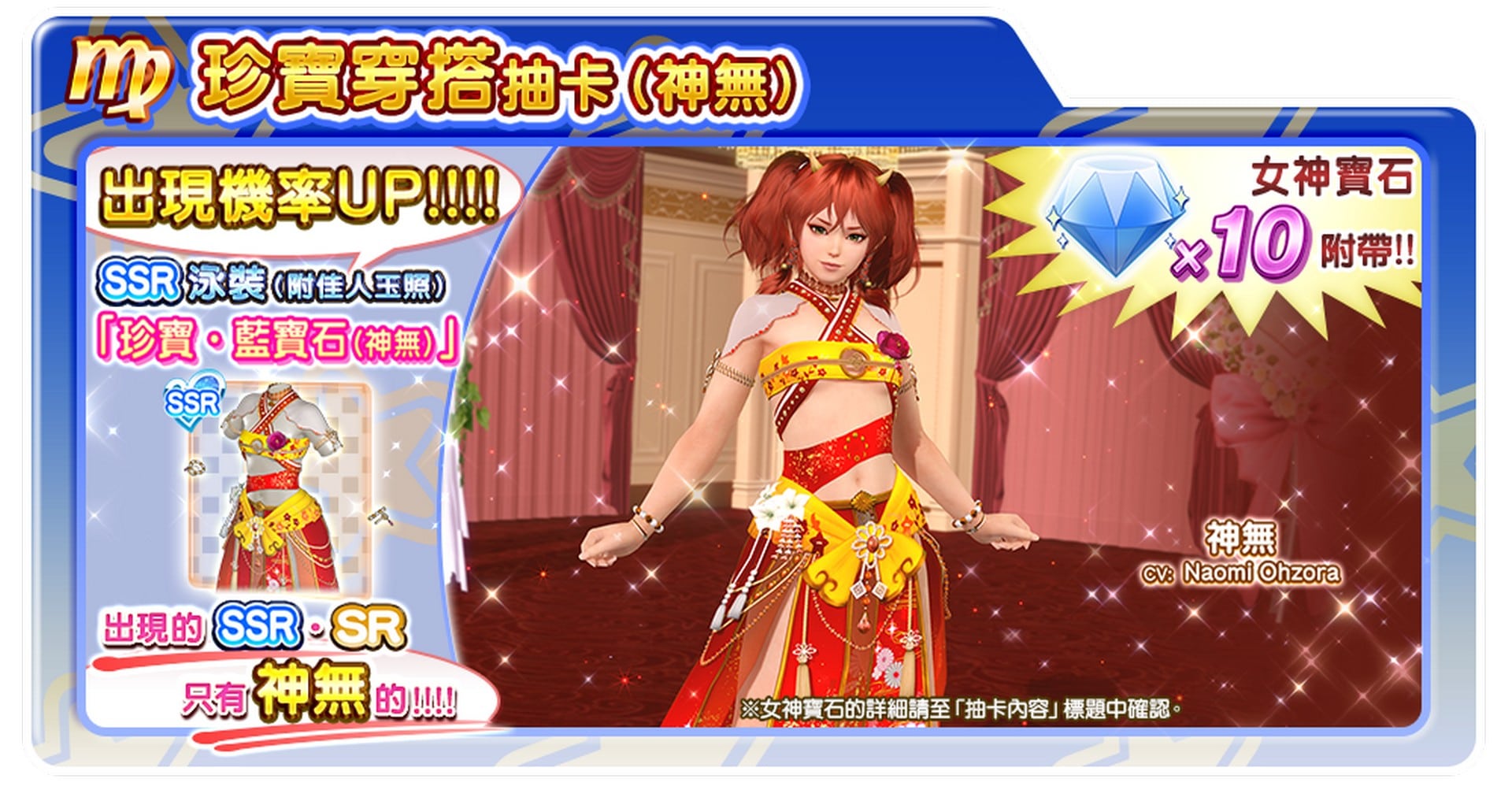 此外,霞、綾音、神無和莫妮卡的新 SSR 泳裝「戀色伊呂波」也在風潮穿搭抽卡期間限定登場。本次的 10 連抽卡只要抽 3 次,就可以免費再抽 1 次 10 連抽卡。懷舊穿搭抽卡有過去登場的凪咲、環、紅葉和女天狗的 SSR 泳裝「戀色伊呂波」再次登場。同樣只要抽 3 次 10 連抽卡便可以再免費抽 1 次 10 連抽卡。此外還有可以優惠購買「V 心石」的「珍寶 V 心石包」。