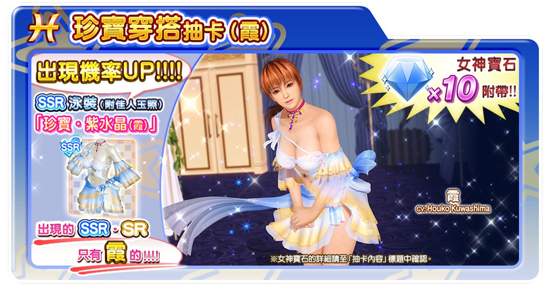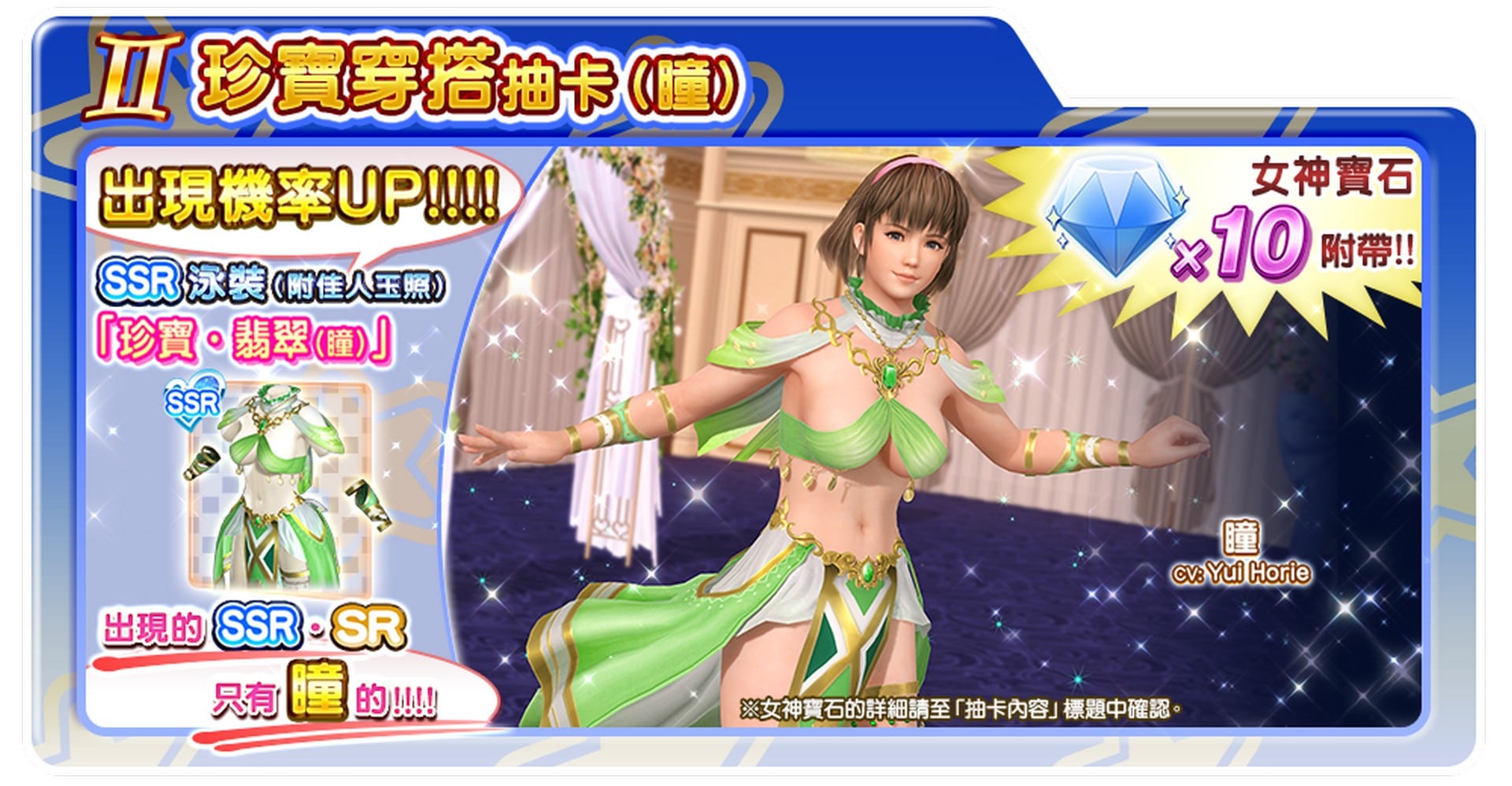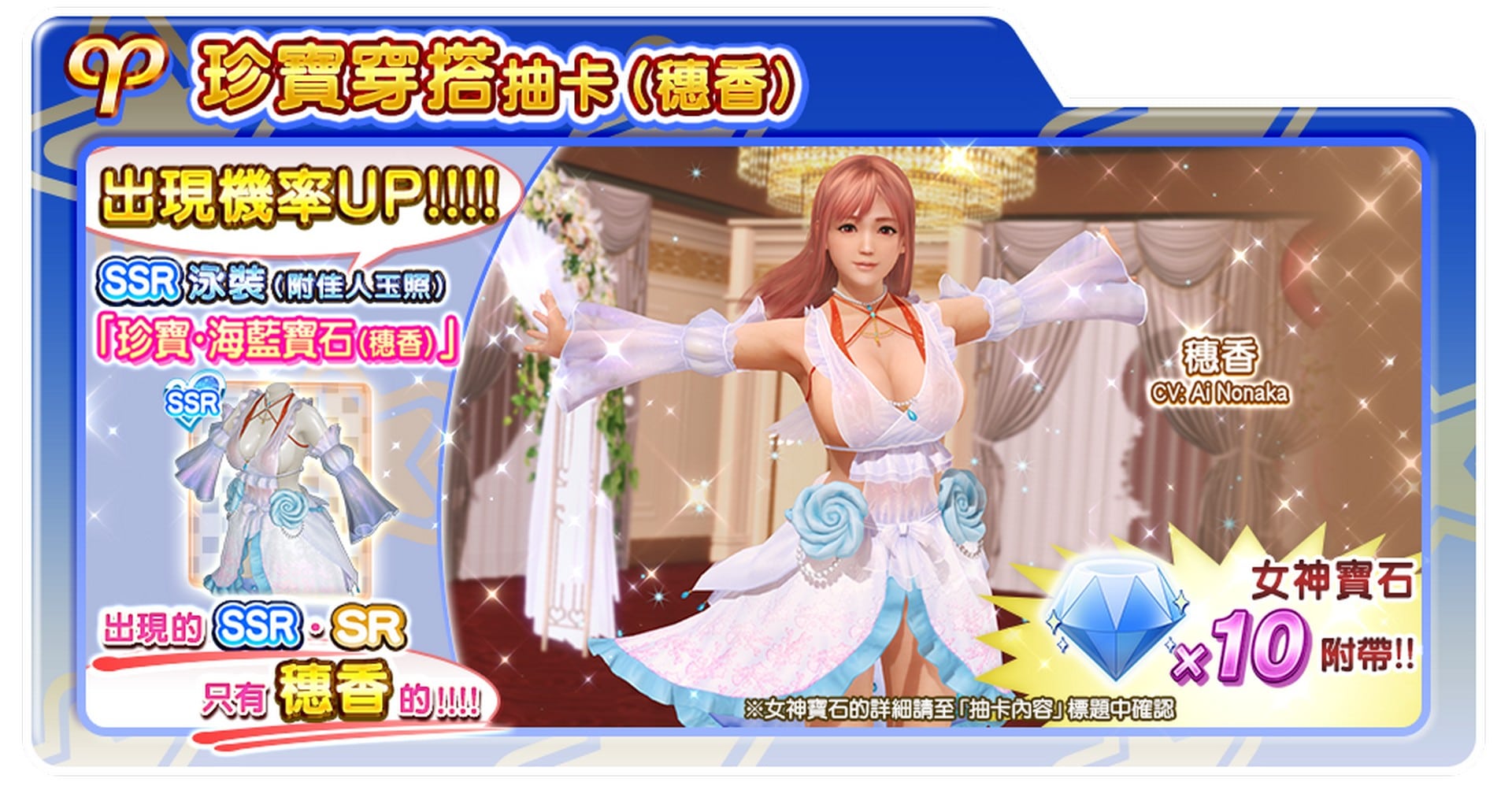「珍寶穿搭」是在女孩們的「生日」還有「特別的日子」登場,和女孩創造特別回憶的女孩專用的 SSR 泳裝。即日起,從去年 11 月 19 日登場的女天狗珍寶穿搭,到今年 10 月 24 日登場的筑紫,全體 20 人份的珍寶穿搭,在期間限定的珍寶穿搭抽卡再次登場。此外,10 連抽卡的額外贈品可以獲得 10 個「女神寶石」。「女神寶石」可以兌換珍寶穿搭和約束的戒指等稀有道具。原本只有特定期間登場的「珍寶穿搭」一口氣再次登場,請務必抓緊這寶貴的機會挑戰獲得喜歡女孩的「珍寶穿搭」。