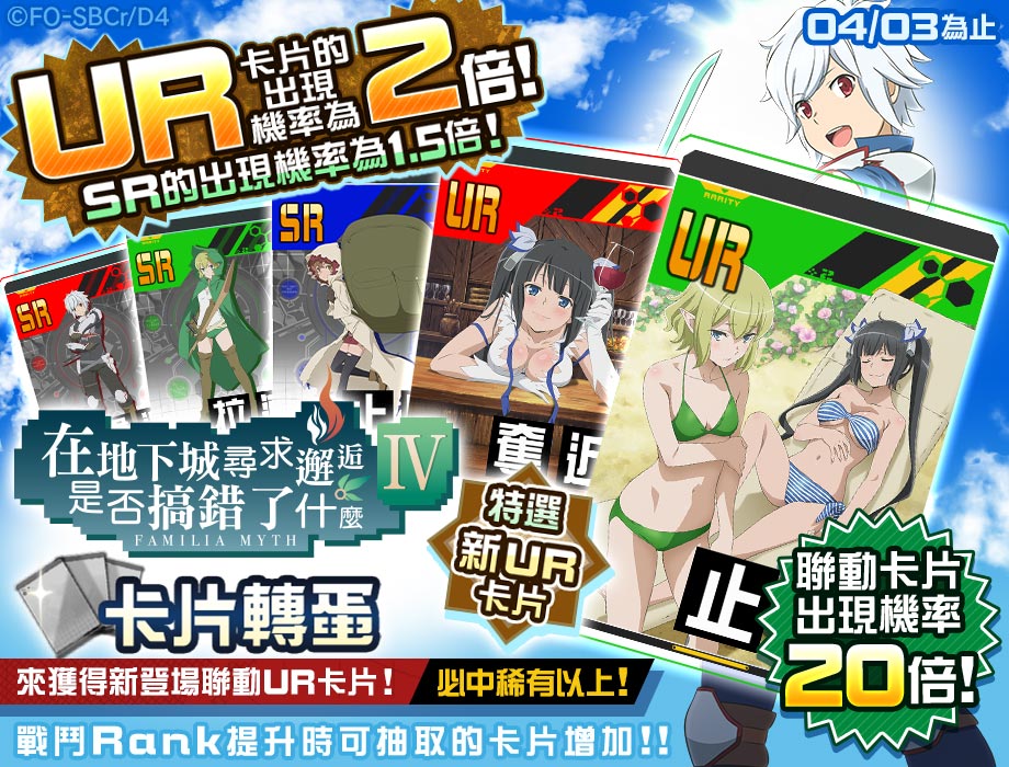 即時對戰手機遊戲《#空帕斯:陣地攻防戰》即日起,與動畫《在地下城尋求邂逅是否搞錯了什麼 IV》展開合作。新合作英雄「貝爾 克朗尼」參戰。新效果的技能卡,赫斯緹雅主題的聯動扮裝登場,特選英雄轉蛋、卡片轉蛋,登入獎勵等紀念活動。