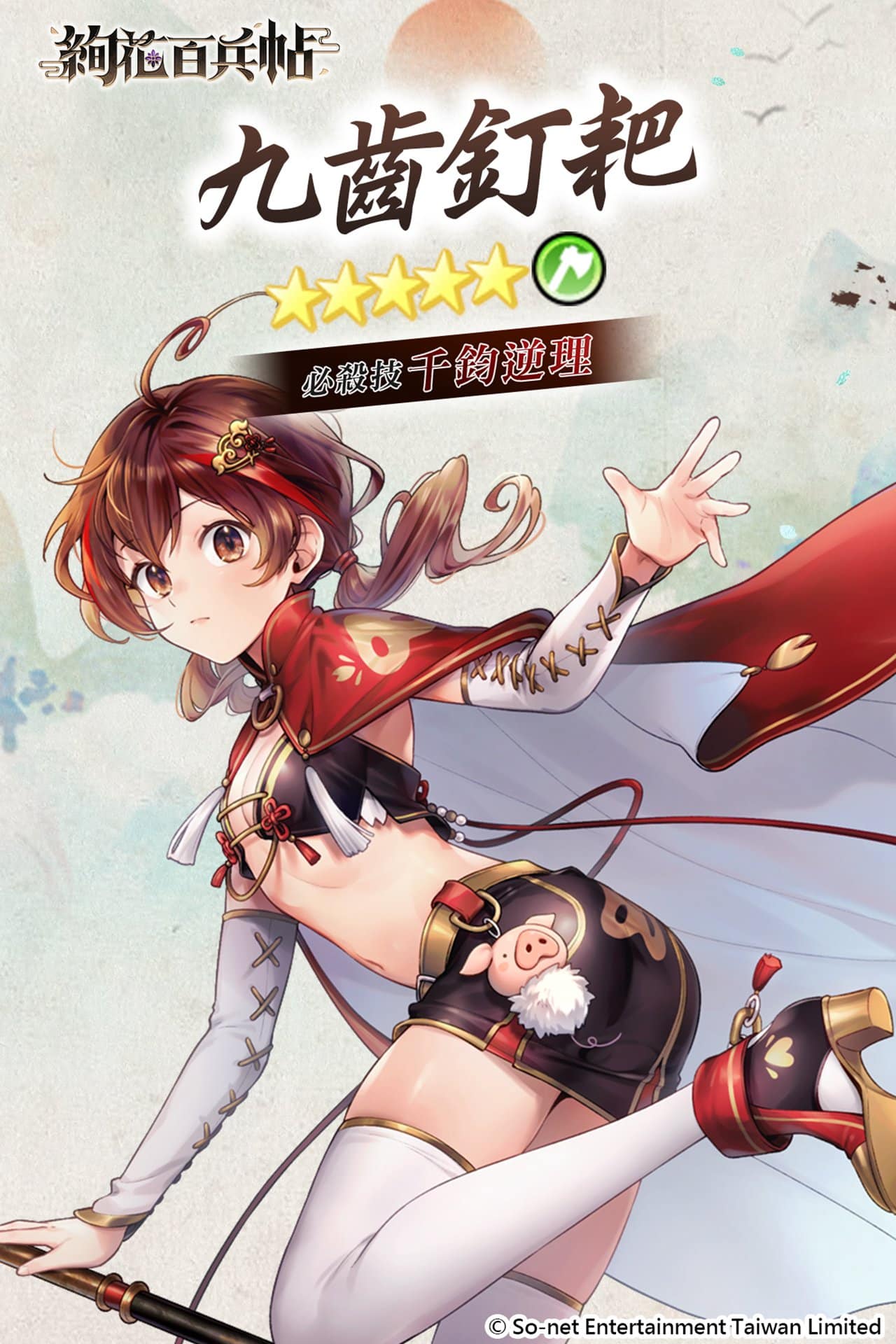 更加碼推出第三位劍姬,同出自西遊記中豬八戒的武器「九齒釘耙」。可愛的外表與豬八戒好色跟班的形象大相逕庭,揮舞巨大沉重的釘耙,培養出冷靜沉穩的性格,與「如意金箍棒」是姐妹關係,但只要看到可愛的豬周邊會失去冷靜,為土屬性五星重兵器劍姬。