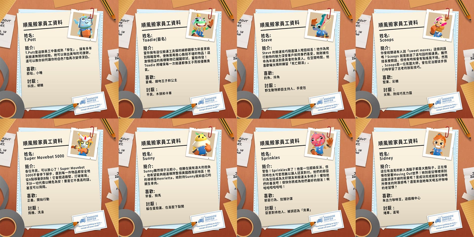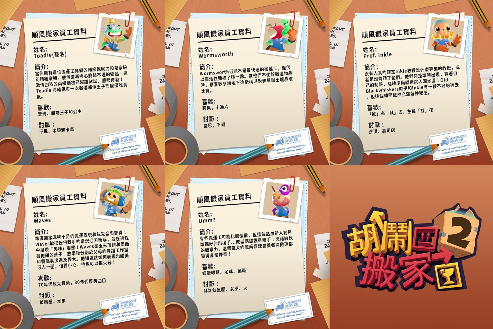 除了舊班底「神奇五俠(Fab 5)」的 Mel、Sidney、Rye Yu、Nim 和 Steve 以外,《胡鬧搬家 2》還有另外 40 多位同事,總共 51 位可遊玩角色。