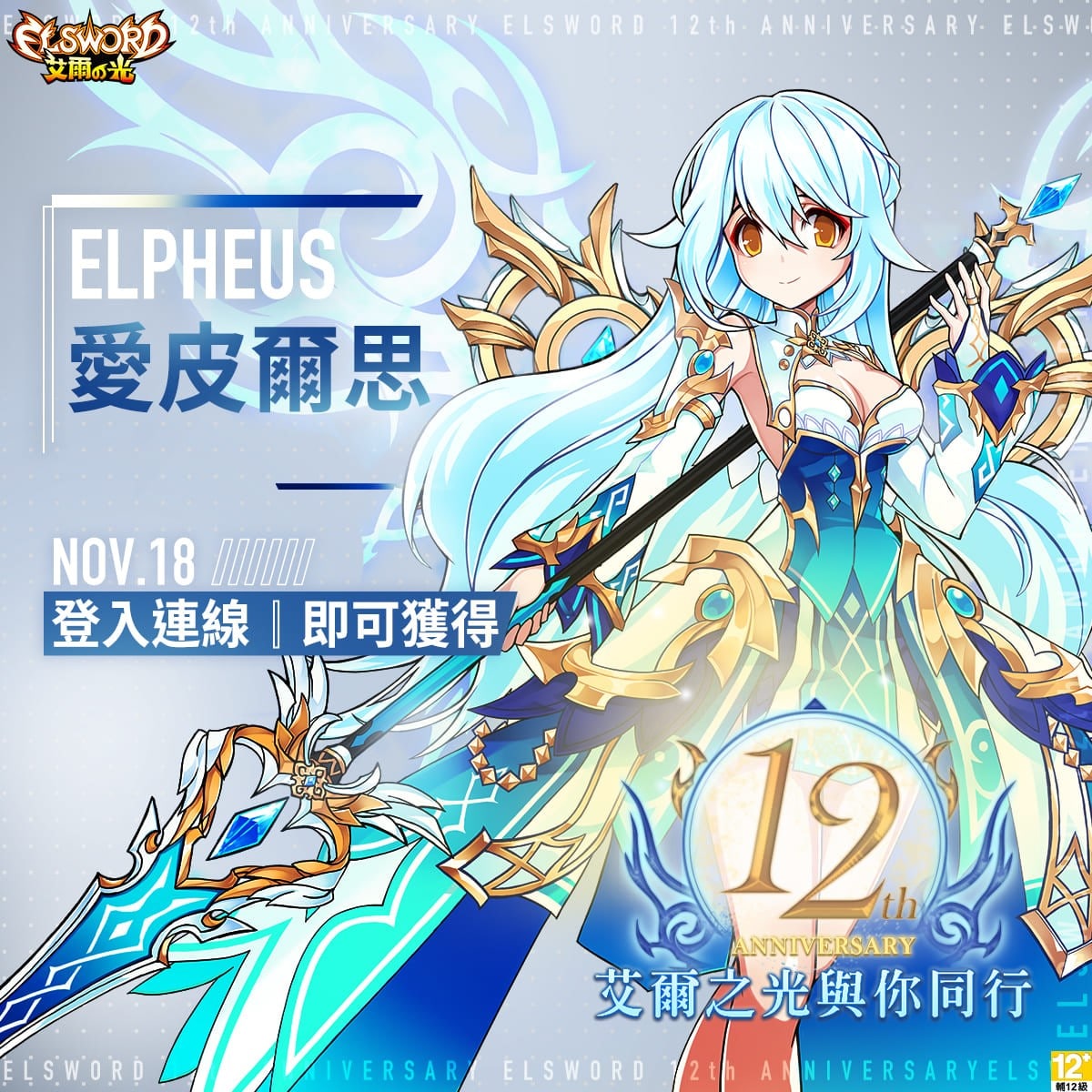 12 週年慶祝活動將於 11 月 18 日 00:00 正式開跑,當日連線滿 20 分鐘,可領取「12 週年感謝有你同在」一個部位的時裝箱,累積連線滿 180 分鐘,即可獲得全套冰裝。2021 全新角色「諾亞」將配發「弧光天使」冰裝;諾亞以外的角色則配發「愛皮爾思」冰裝,兩套冰裝皆是首次作為免費獎勵發送。