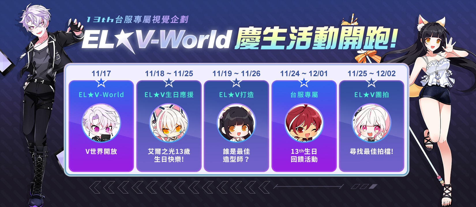 為帶給全台服玩家更深刻的慶祝紀念,官方特別打造【EL★V-World】網頁活動,以時下 VTuber 為概念打造全新宣傳,並設定別於遊戲世界觀的「虛擬 V-World 世界」與「EL★V 角色」新形象,將遊戲中的角色「艾索德」、「Add」、「伊芙」、「艾拉」、「菈比」以新形象及世界觀人物設定登場,搶先釋出「EL★V-World 慶生紀念影片」獻給全體玩家。
