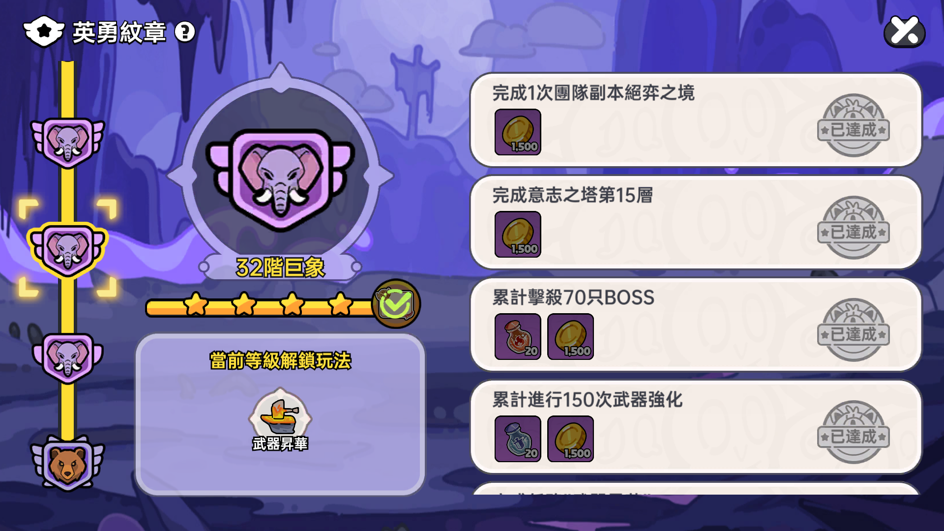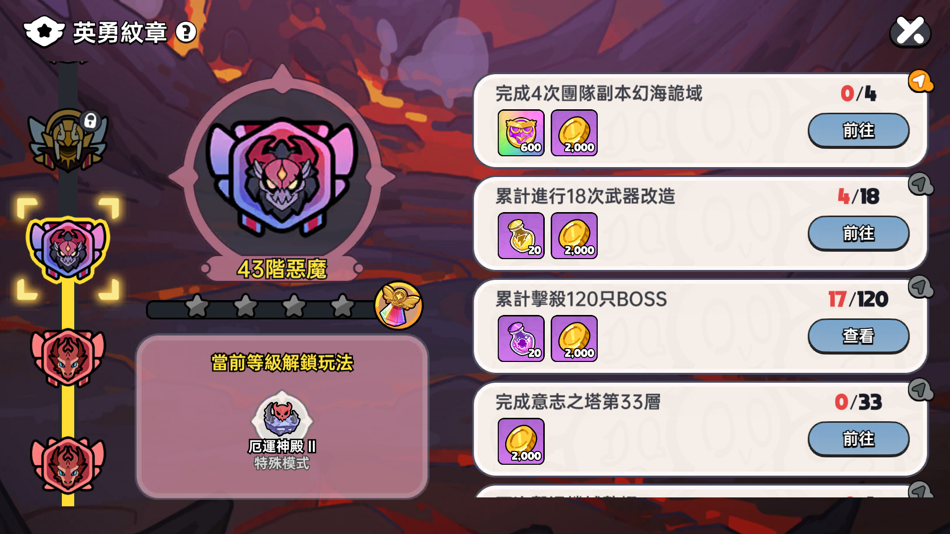 在《英勇之地》中,紋章不只是等級的代表,更象徵著玩家在冒險旅途中的成長與實力。遊戲將玩家的等級劃分為 15 階紋章段位,從「菜鳥」、「狡兔」、「靈鹿」一路推進到「神王」。每晉升一階,除了能解鎖新玩法、開啟挑戰副本外,也能領取對應獎勵。