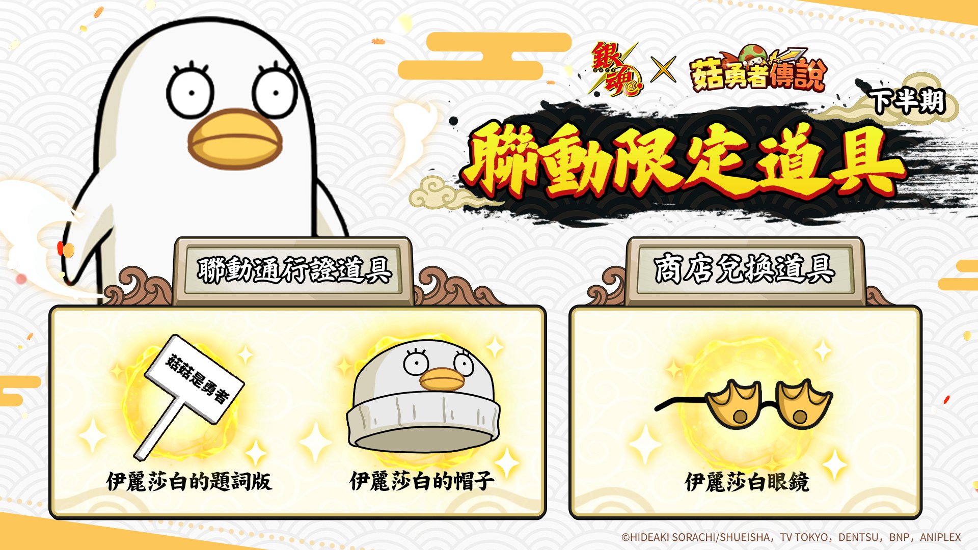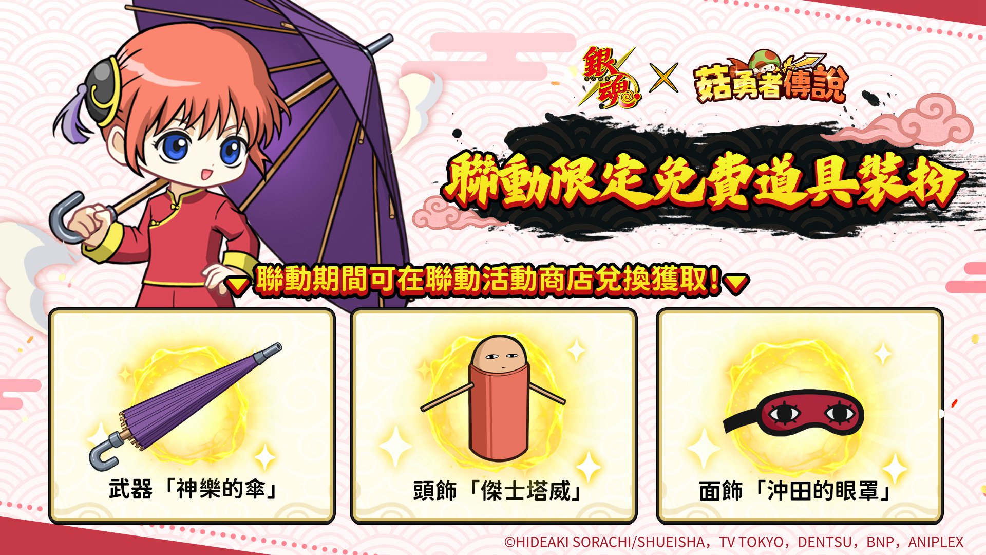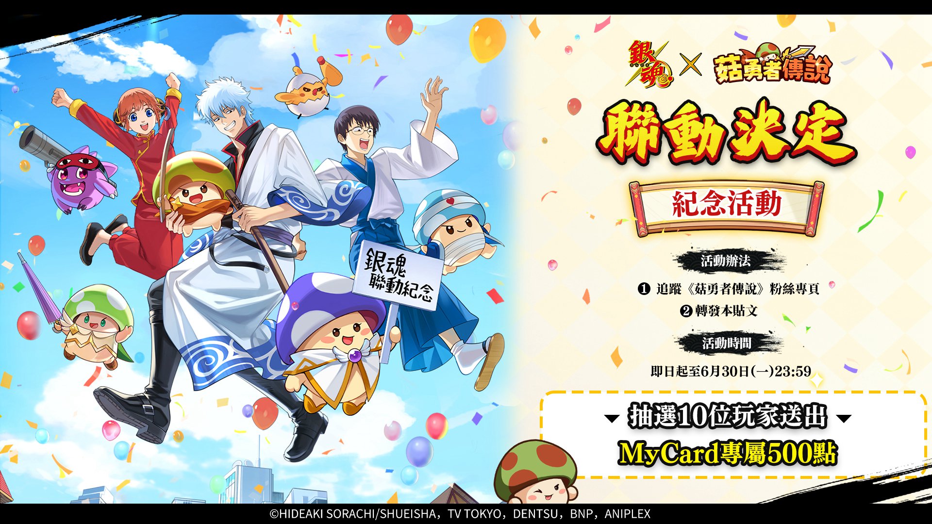 為紀念《菇勇者傳說》× TV 動畫《銀魂》的聯動活動,《菇勇者傳說》官方將於 FB 專頁展開紀念活動,只要追蹤《菇勇者傳說》FB 粉絲專頁並轉發聯動貼文就能參與,官方將抽出 10 位幸運玩家送出 MyCard 專屬 500 點。
