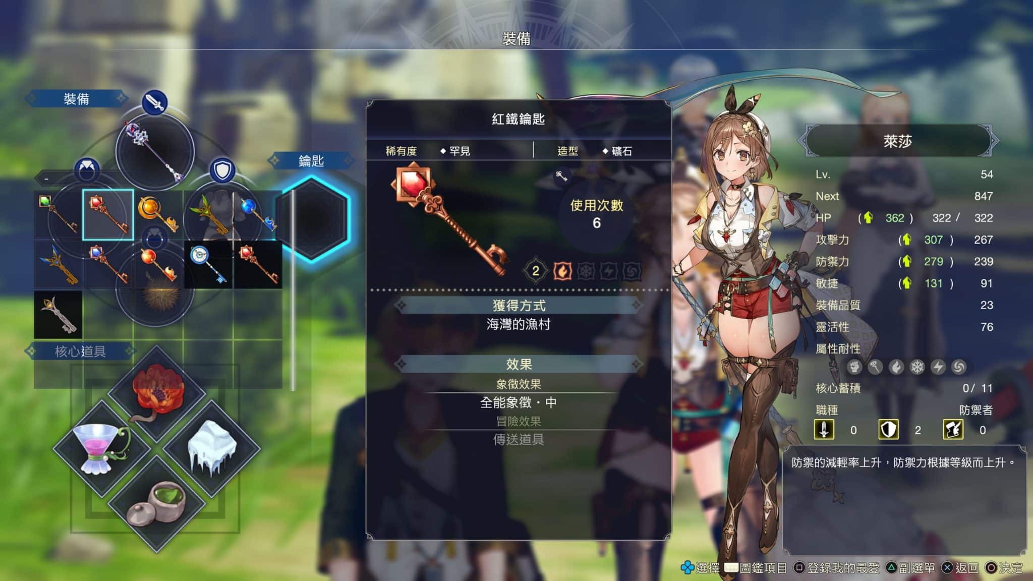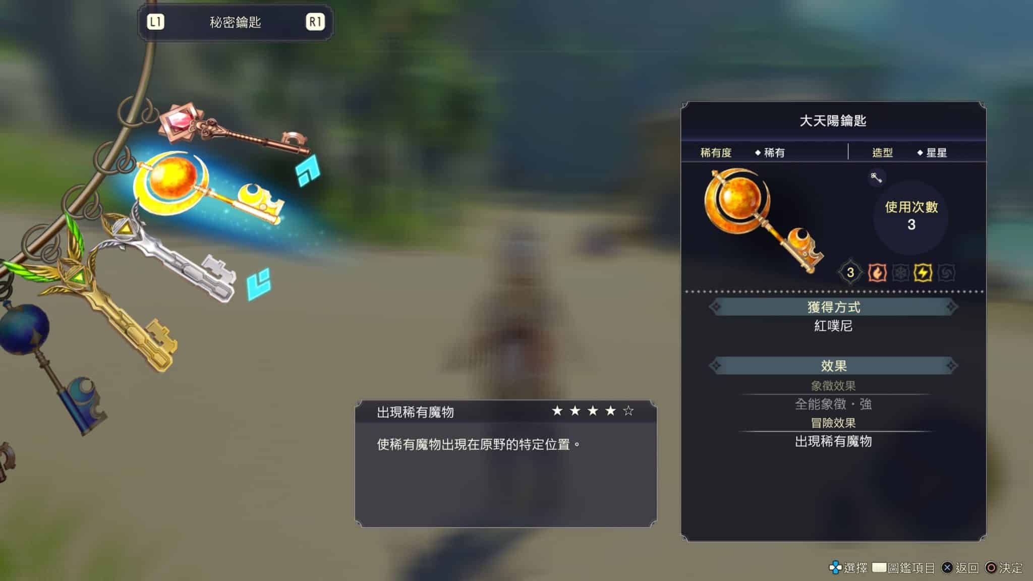 鑰匙有著各式各樣的種類及效果。在戰鬥或地標中取得鑰匙後,不要忘了裝備,不只可以用在戰鬥、調合,還可以在原野探索中提供幫助。拿到強力的鑰匙不要忘了裝備在鑰匙串上,裝備後就可以在戰鬥或探索中使用。
