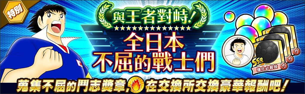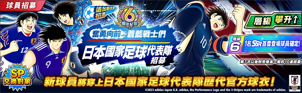 到 6 月 16 日 12:59 為止,曾在遊戲內登場,穿著 6 款日本國家足球代表隊歴代官方球衣(1997/2006/2017/2018/2020/2022年)的大空翼、日向小次郎、松山光和新田瞬將以新選手的身份登場。此外,還將舉辦「與王者對峙!全日本不屈的戰士們」活動,玩家可於本次活動中獲得能在「6 週年紀念:奮勇向前 蒼藍戰士們:日本國家足球代表隊票券招募」使用的招募券。