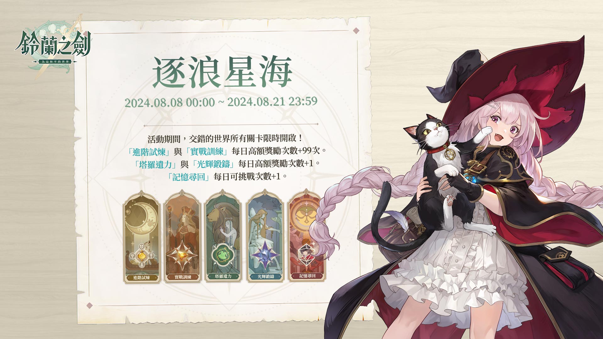為了慶祝《鈴蘭之劍》於 8 月 1 日全球伺服器同步上線,特別準備了特別簽到活動。即日起參與活動即可獲得獎勵,包括傳說級角色「法卡爾」、獨特的頭像框及可愛的傢俱。「科爾的午後」生涯通行證同步正式開啟。達成通行證等級,不僅能獲得大量「希望晶石」和養成資源,還能解鎖全新外觀「毛茸茸的午後」,為科爾增添獨特魅力。