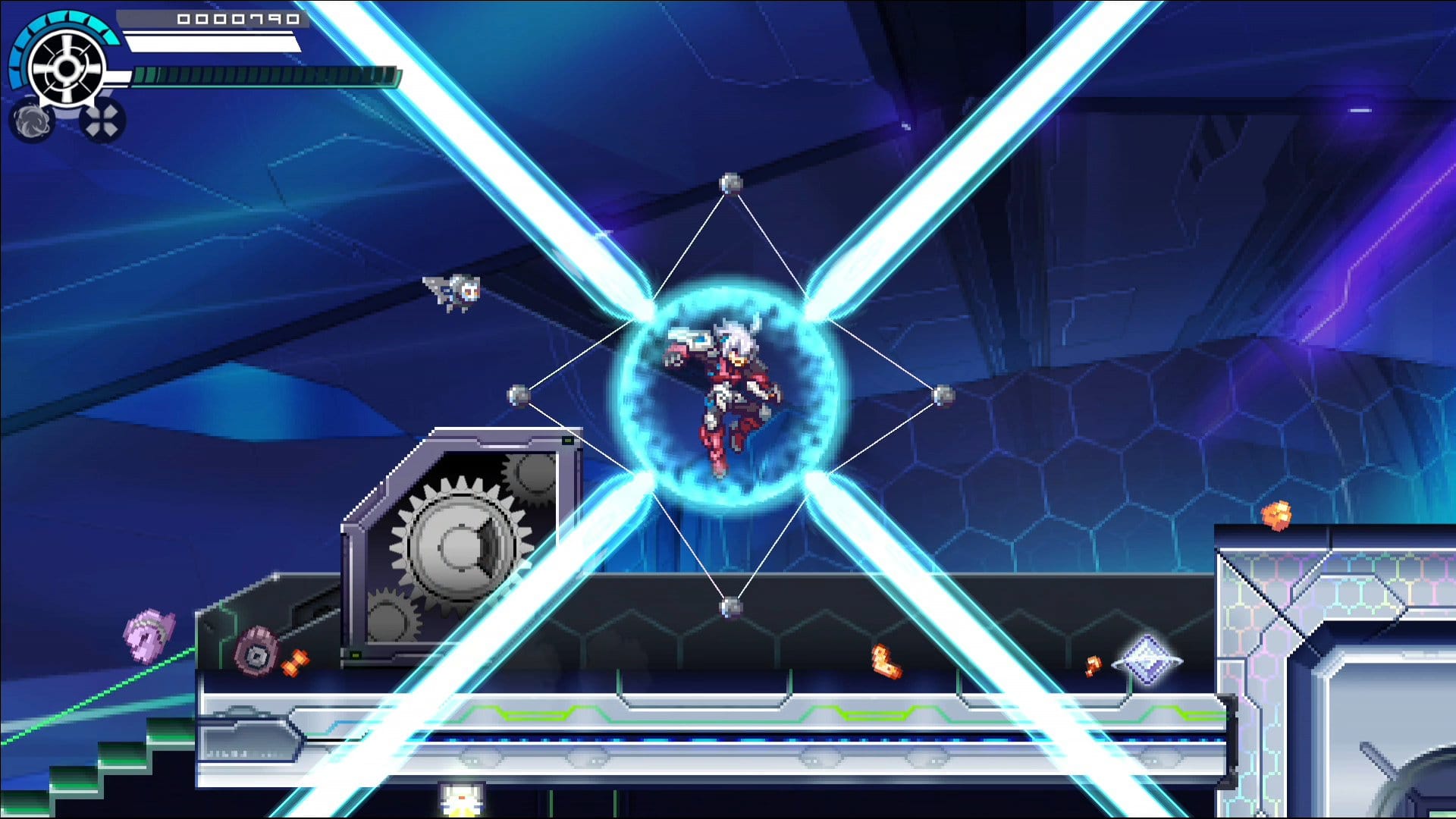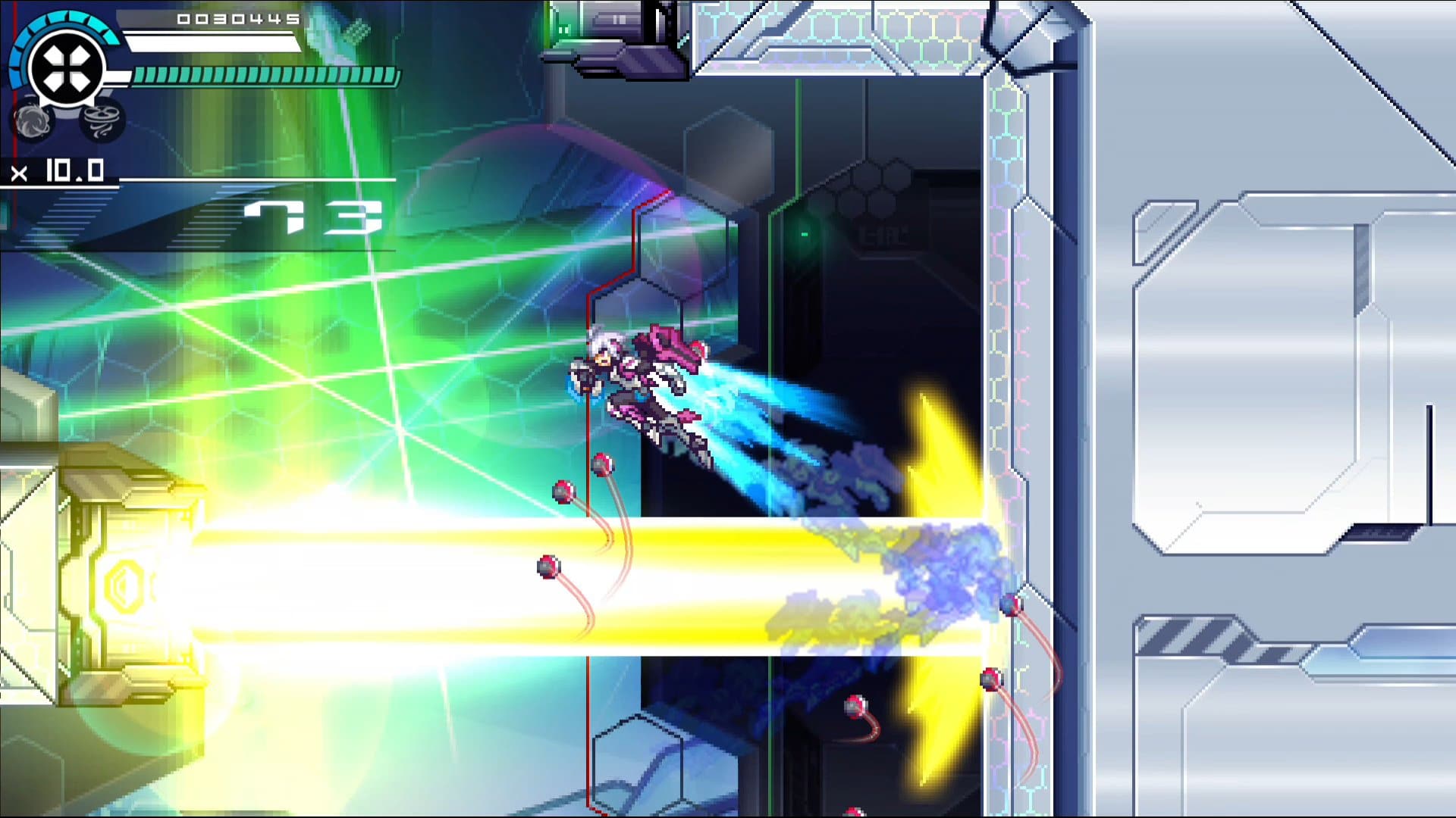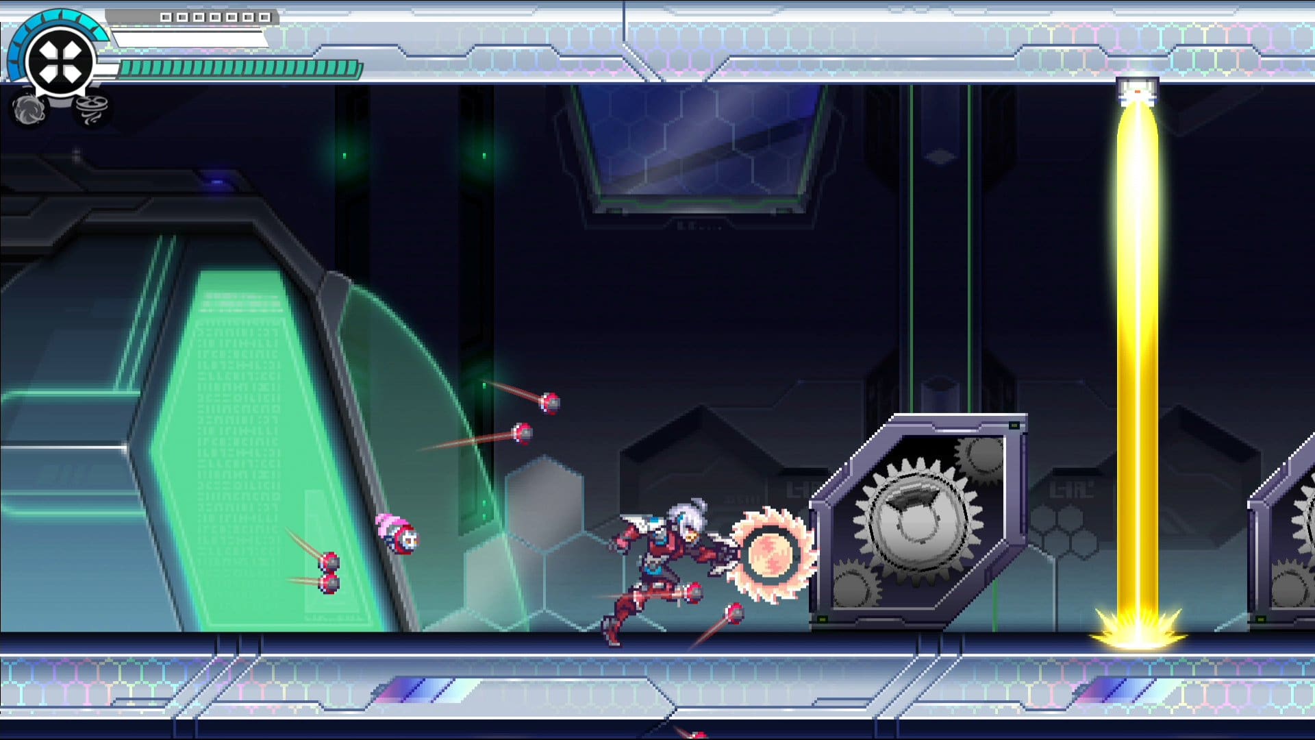 設置了眾多光學兵器的雷射研究設施,藉由迷宮般錯綜複雜的地形和森嚴的警備系統阻擋著入侵者的去路。被光束陷阱封鎖的道路,用裂破轉輪轉動齒輪型的開關;接連發射的巨大雷射砲,利用電光衝刺一口氣穿越。