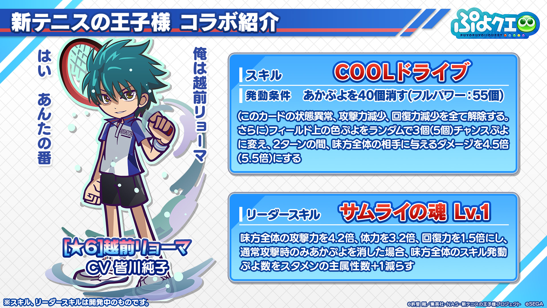 SEGA 旗下手機遊戲 ぷよぷよ!!クエスト《魔法氣泡!!Quest》發表將與電視動畫《新網球王子》在 8 月 9 日到 8 月 29 日舉辦合作活動。這次活動中預定將舉辦合作轉蛋推出「越前龍馬」、「手塚國光」、「跡部景吾」等角色,也會有限定關卡跟限定故事提供給玩家挑戰。