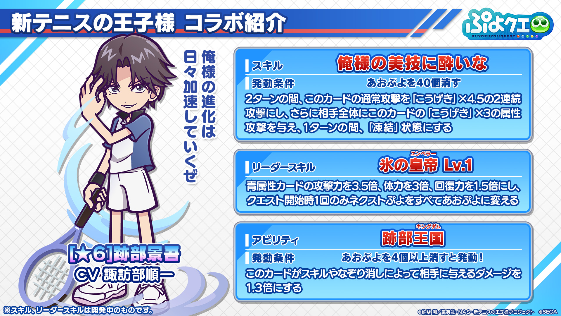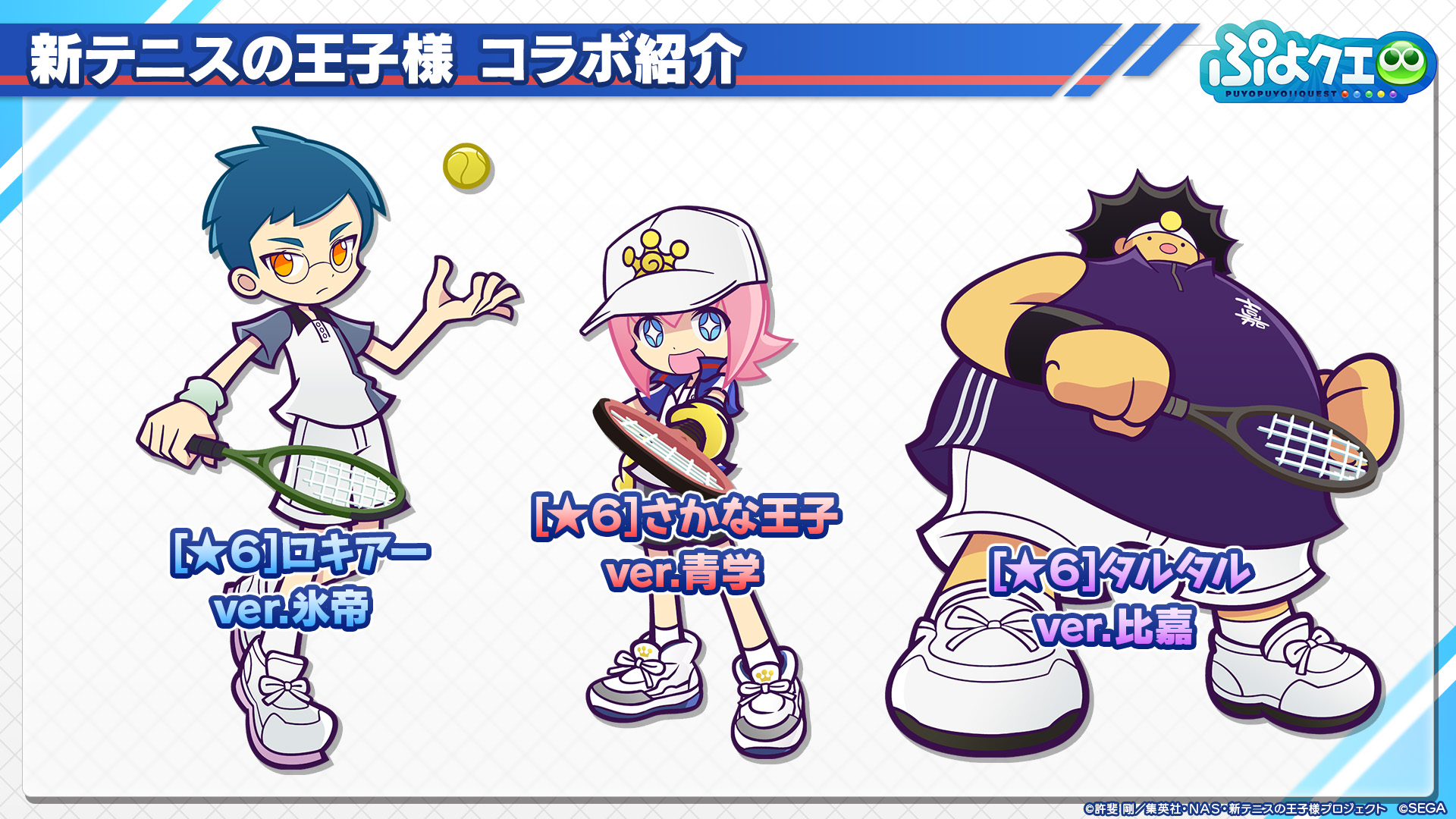 SEGA 旗下手機遊戲 ぷよぷよ!!クエスト《魔法氣泡!!Quest》發表將與電視動畫《新網球王子》在 8 月 9 日到 8 月 29 日舉辦合作活動。這次活動中預定將舉辦合作轉蛋推出「越前龍馬」、「手塚國光」、「跡部景吾」等角色,也會有限定關卡跟限定故事提供給玩家挑戰。