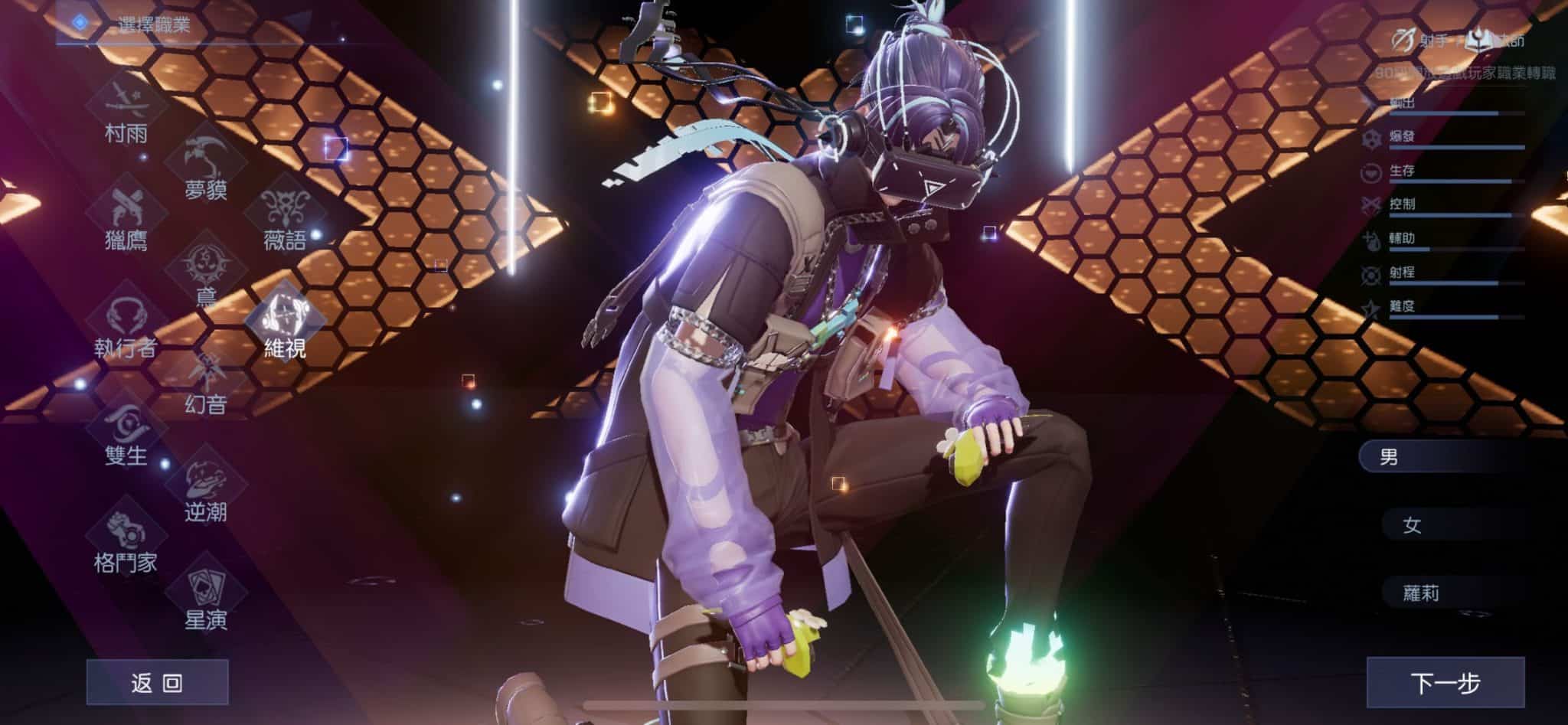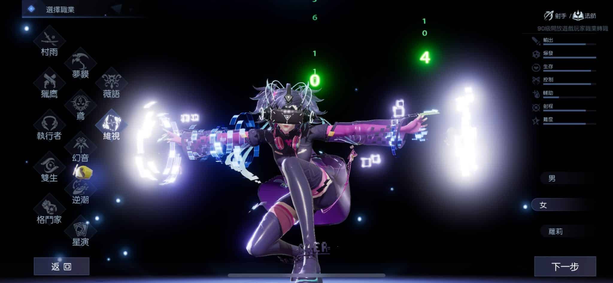 作為一個跨越次元的存在,維視這個職業主要利用數據和特殊的裝備進行戰鬥。他們同時也是一個具有雙形態的職業。維視的兩種形態中,一種通過操控全息螢幕,召喚各種裝備進行範圍攻擊和控制,是團隊輔助的好幫手。另一種形態則利用 VR 眼鏡和手柄,親身上陣進行戰鬥,超高的火力和靈活的機動性是這一形態的優勢所在,只是大部分技能不受控的情況可能會令人苦惱。