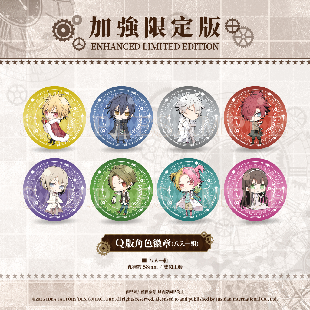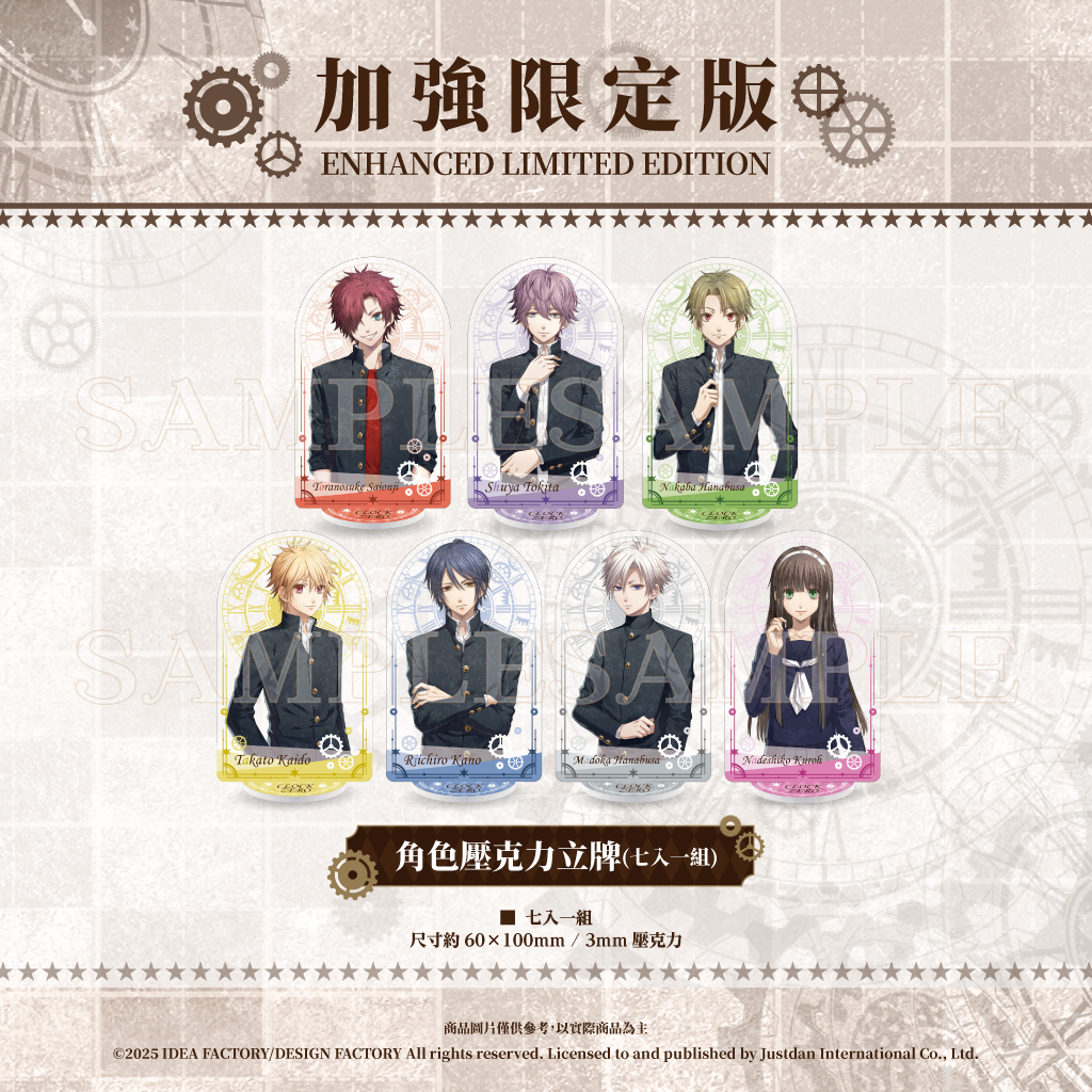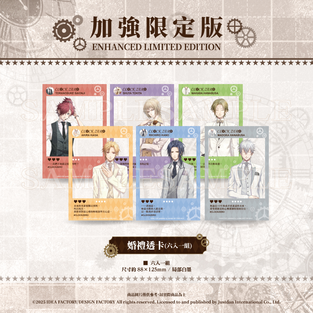 預購首批遊戲的玩家,即可獲得精美角色明信片(七入一組),每張明信片都精心設計,呈現出每位角色獨特的魅力與個性。加強限定版包含特製外盒、完整中文化小冊子、廣播劇、珠光海報卡、角色收藏卡、含角色訊息的婚禮透卡,以及八款Q版角色徽章、七款角色壓克力立牌等內容。