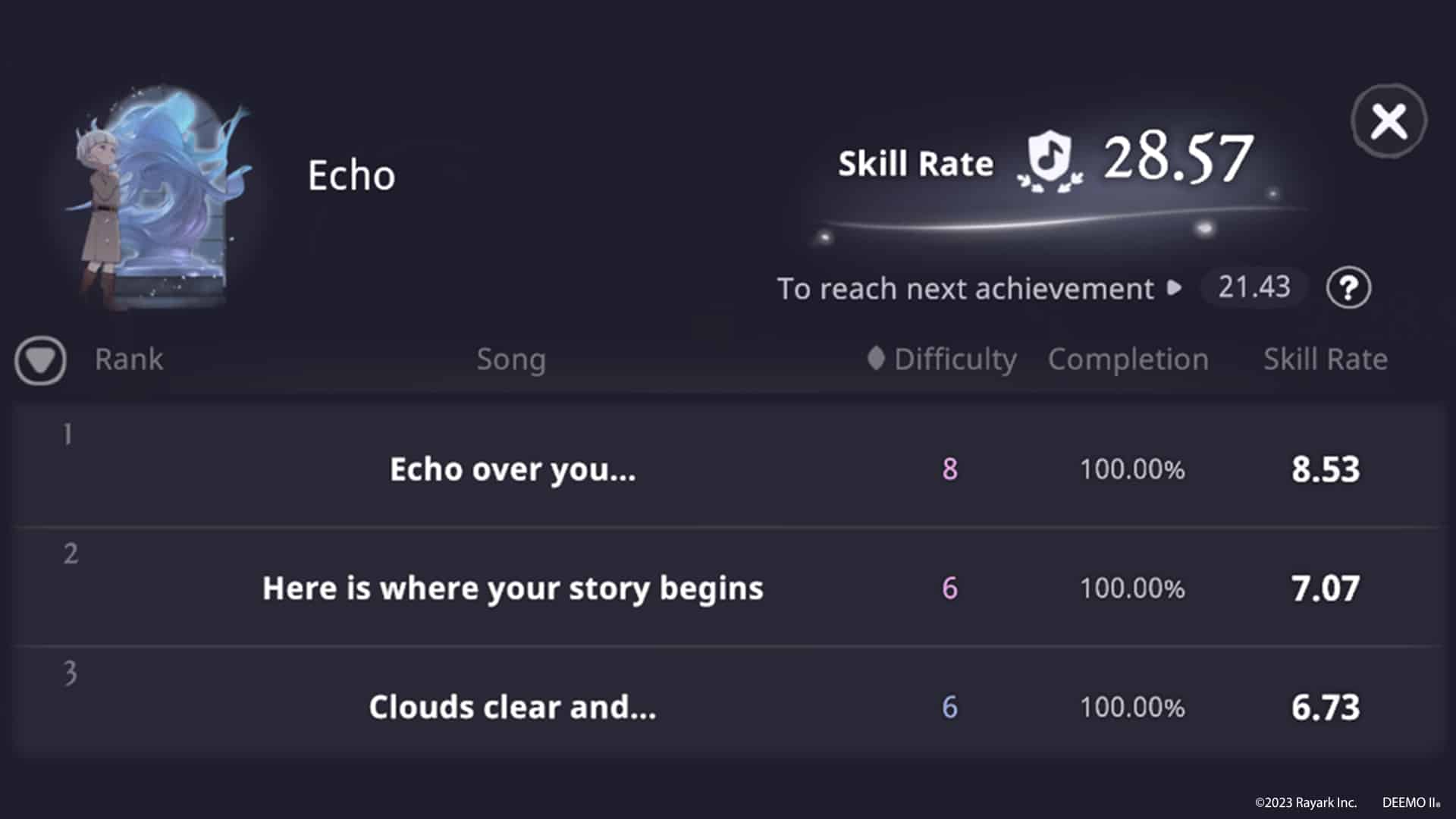 除了主線故事更新外,在《DEEMO II》最新版本中也實裝了許多全新系統和功能。如全新系統「技巧值」,每次演奏結束時會根據譜面難度與完成度等數值計算出技巧值,取前 30 首不同歌曲之最高技巧值進行加總。玩家可透過挑戰自己的極限取得更高的技巧值,也能在成就系統中領取相對應的獎勵。除此之外,還可透過「演奏結算頁面截圖分享」功能、以及全新設計的個人檔案頁面炫耀自己的技巧值。官方期待這些全新功能讓玩家在體驗劇情的同時,也能在音樂遊戲部分有更豐富的體驗。