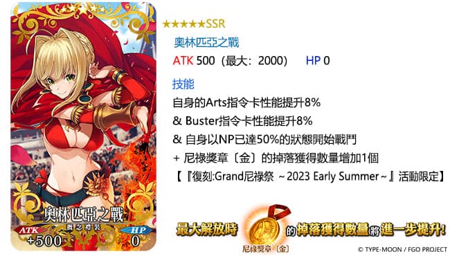 而「★5(SSR)奧林匹亞之戰」、「★4(SR)美味競技場」及「★3(R)肌肉騎士」等 3 款限時概念禮裝,也將登場於上述兩個 PICK UP 召喚中。當御主們裝備挑戰「復刻:Grand 尼祿祭 ~2023 Early Summer~」時,除了擁有既有的增益效果,通過後還能有效提升「尼祿獎章(金/銀/銅)」等活動道具的掉落獲得數量。
