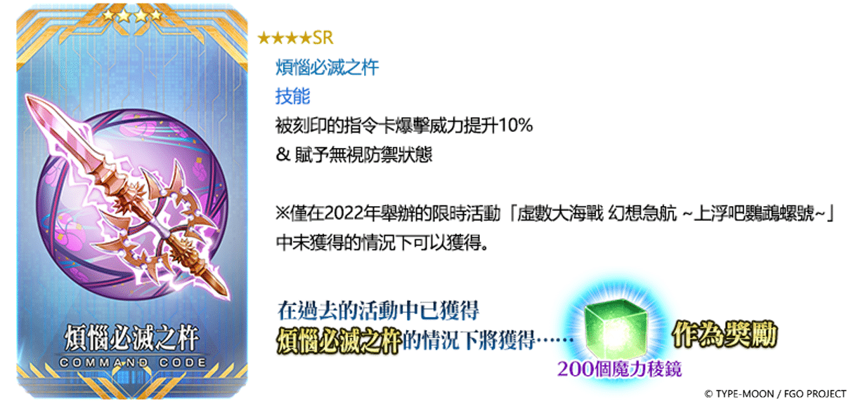 在 2022 年舉辦的限時活動「虛數大海戰 幻想急航 上浮吧鸚鵡螺號」中獲得過任務獎勵「★5(SSR)天帝的貴妃」、「★4(SR)煩惱必滅之杵」及「★3(R)利維坦」等 3 款指令紋章的御主,本次活動獎勵將由指令紋章變為稀有魔力稜鏡或魔力稜鏡。
