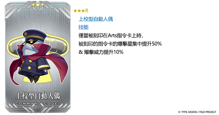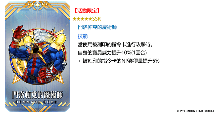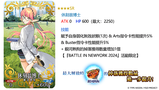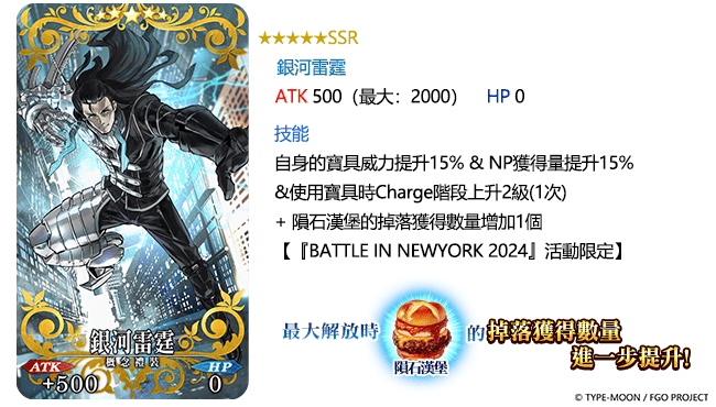 除了以上從者之外,限時概念禮裝「★5(SSR)銀河雷霆」、「★4(SR)休刻翁博士」、「★3(R)秘密公司 Assassin」也將登場。進行活動任務時,裝備上限時概念禮裝,除了擁有概念禮裝既有的強化效果,還能有效提升機率掉落的「隕石漢堡」、「銀河熱狗」及「太空薯條」等活動專用道具。