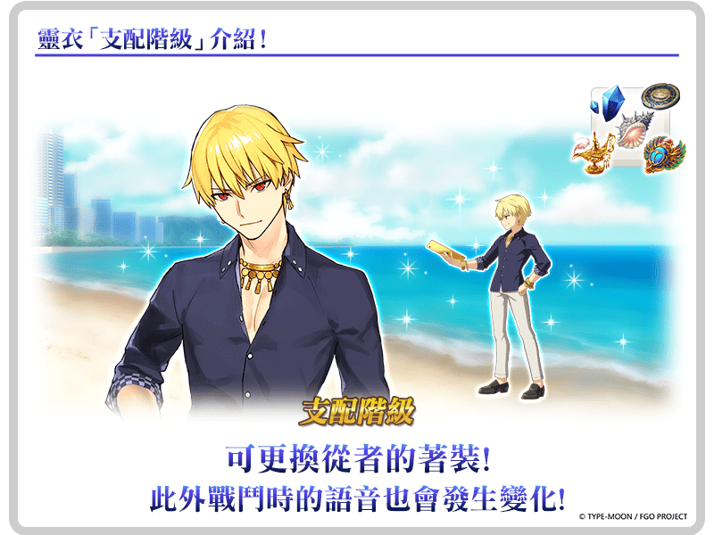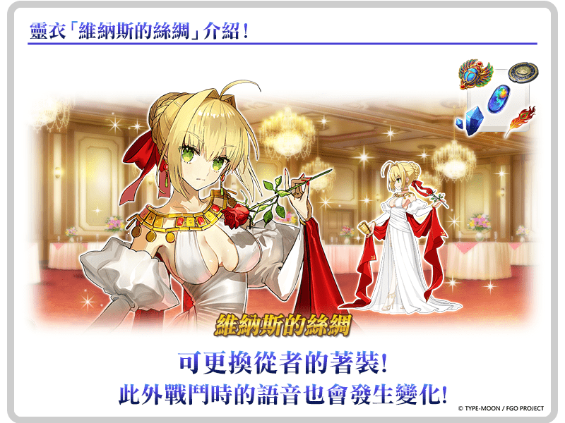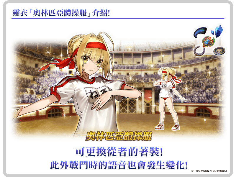在本次活動中可透過道具兌換「★5(SSR)奧德修斯」的簡易靈衣「埃癸斯(第二再臨)」和「埃癸斯(第三再臨)」開放權。達.文西工房內的「靈衣縫製」中也將永久追加「★4(SR)尼祿・克勞狄烏斯〔Saber〕」的靈衣「維納斯的絲綢」開放權獲得任務、「★4(SR)吉爾伽美什〔Caster〕」的靈衣「支配階級」開放權。此外,通過第 1 部 第二特異點後即可免費交換「★4(SR)尼祿・克勞狄烏斯〔Saber〕」的靈衣「奧林匹亞體操服」開放權。