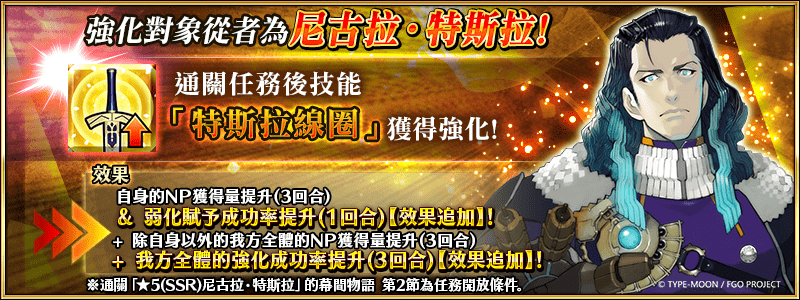 此外,迦勒底之門也將永久追加「★5(SSR)尼古拉・特斯拉」、「★4(SR)湯瑪斯・愛迪生」等 2 騎從者的強化任務,只要擁有本次強化的對象從者、並完成最終再臨的御主,通過任務後,不僅可強化對象從者,更將獲得聖晶石作為獎勵。