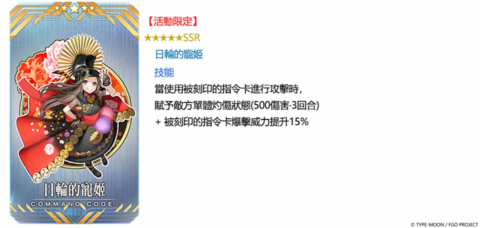 蒐集對應數量的「茶道點數」,不僅可獲得活動限定指令紋章「★5(SSR)日輪的寵姬」、傳承結晶及呼符等獎勵,亦能獲得增加「茶葉」掉落數量的活動限定概念禮裝「★5(SSR)旅途餞行」,並透過通關活動任務機率掉落的「赤樂茶碗」、「天正大判」及「荒穗茶筅」等活動道具,兌換強化素材、靈基再臨素材及活動限定概念禮裝「★5(SSR)旅途餞行」。