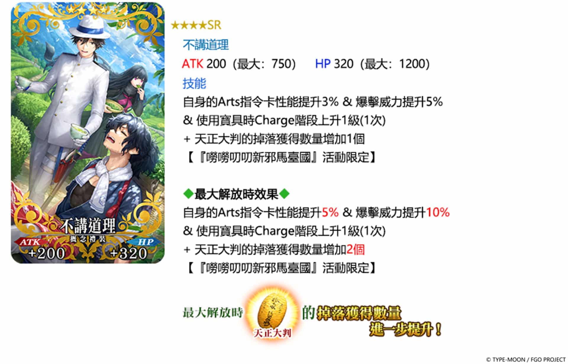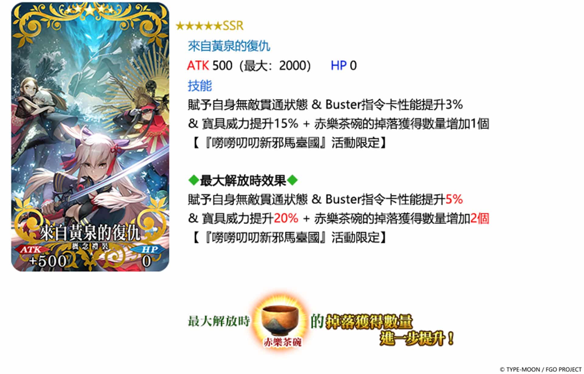 同期間登場的,還有「★5(SSR)來自黃泉的復仇」、「★4(SR)不講道理」及「★3(R)泥土之成果」等 3 種限時概念禮裝。御主們只要裝備上述 3 種限時概念禮裝通過本次限時活動,不僅將被賦予概念禮裝既有的增益效果,更能有效提升「赤樂茶碗」、「天正大判」及「荒穗茶筅」等活動道具的掉落數量,讓新邪馬臺國的茶道之戰事半功倍。