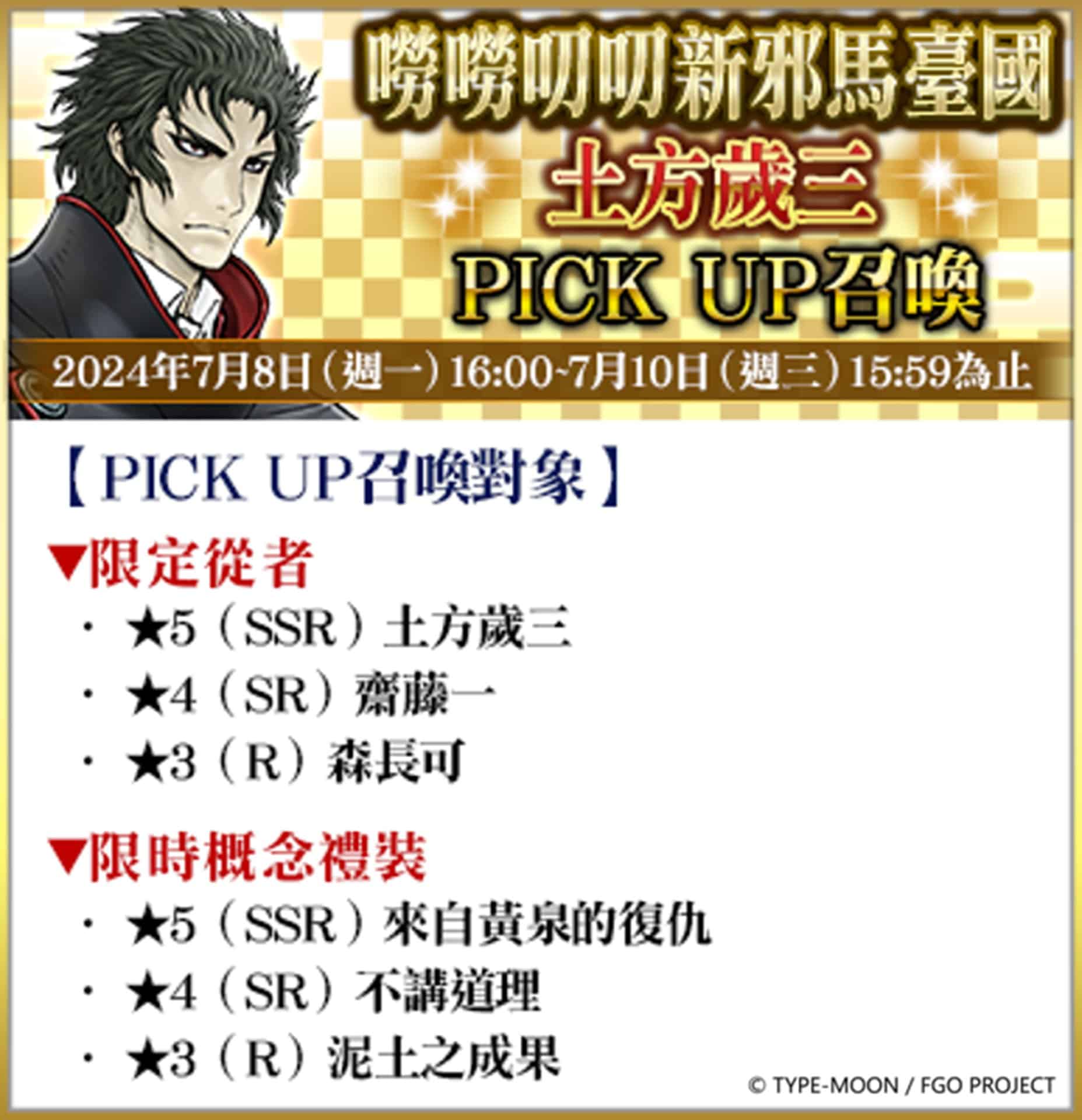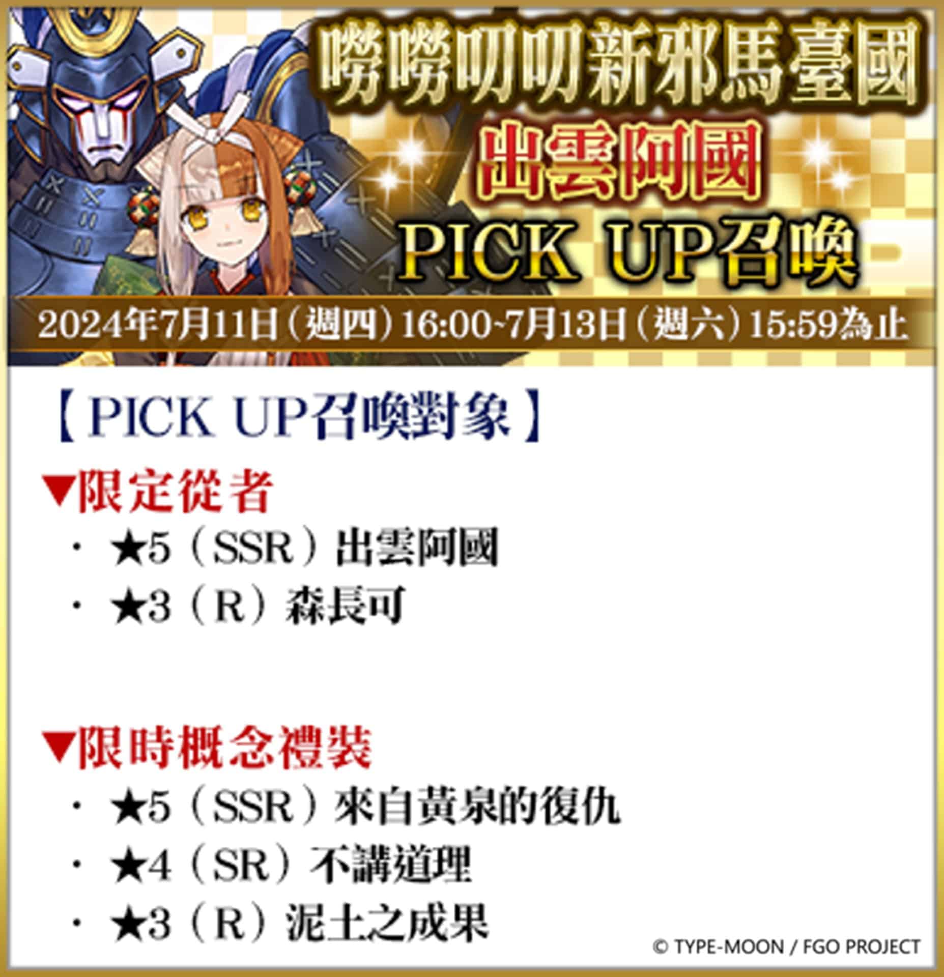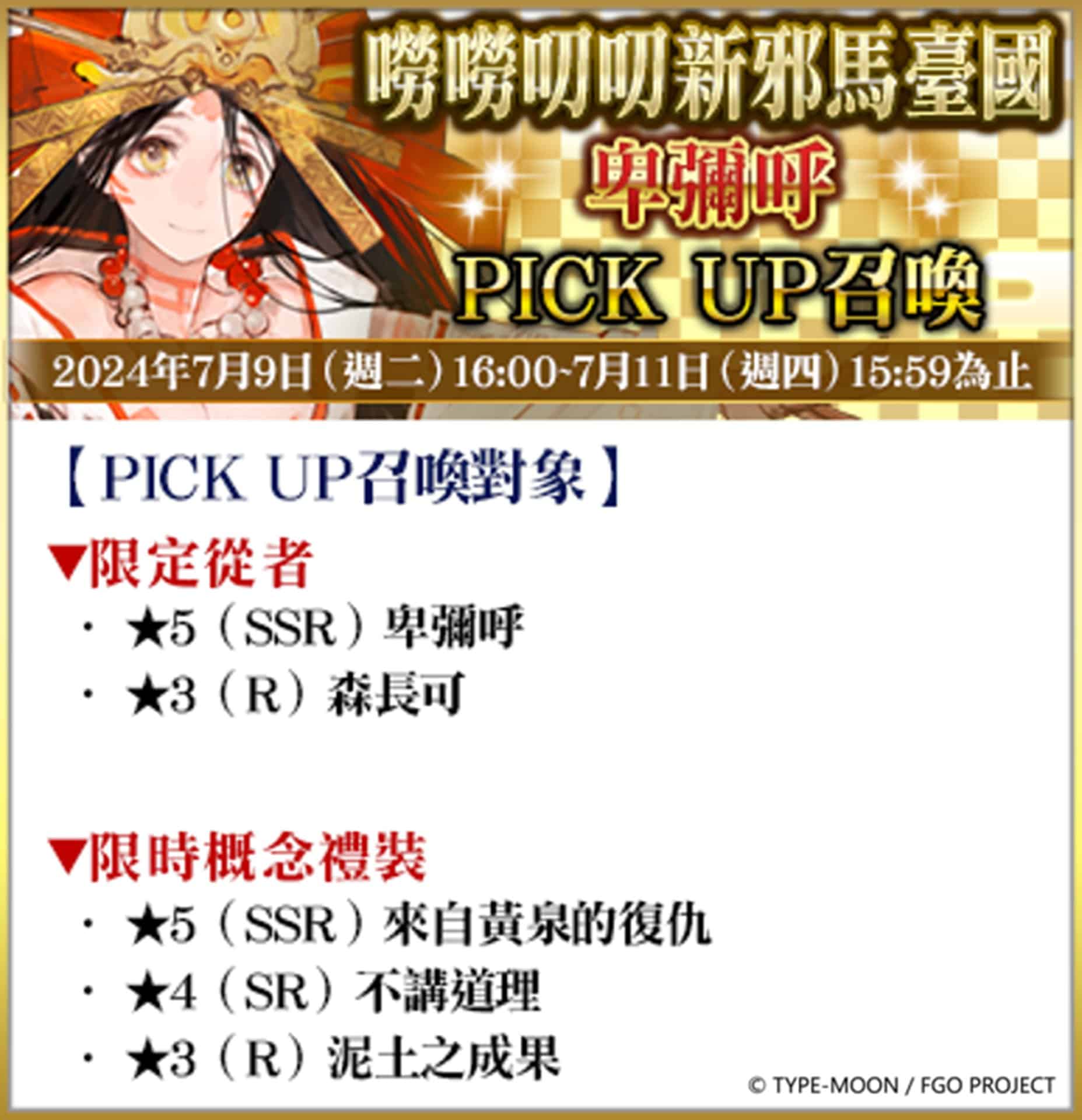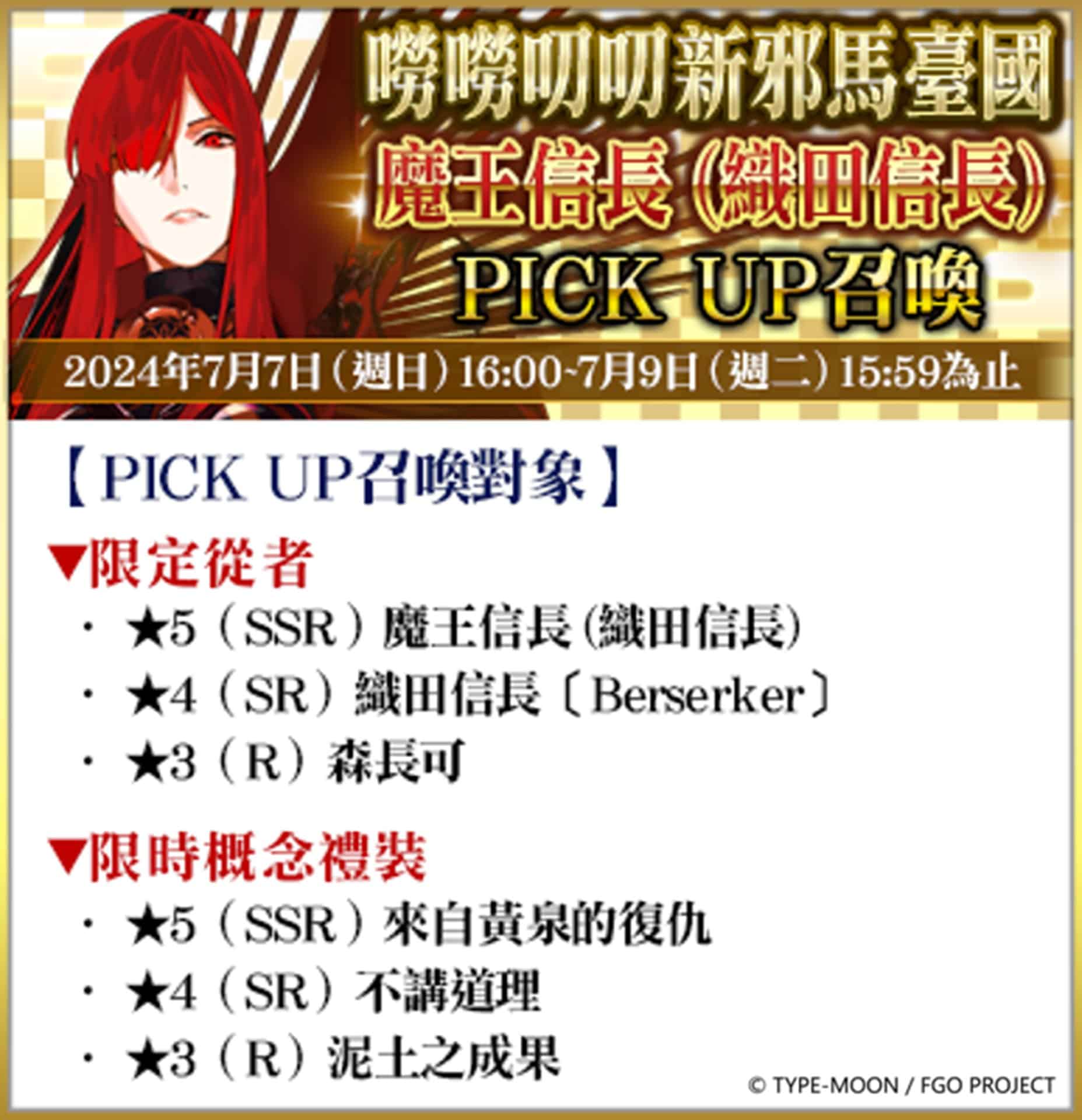 為了紀念本次限時活動的舉辦,自 2024 年 7 月 7 日 16:00 至 2024 年 7 月 15 日 15:59 期間,開放「嘮嘮叨叨新邪馬臺國 PICK UP 召喚 2」,將有包含限定從者「★5(SSR)魔王信長 (織田信長)」等 11 騎從者,於 7 種召喚卡池陸續登場。