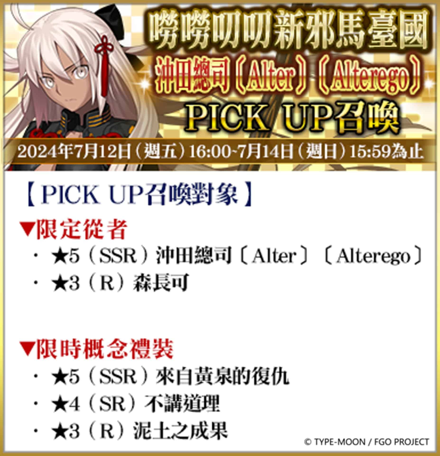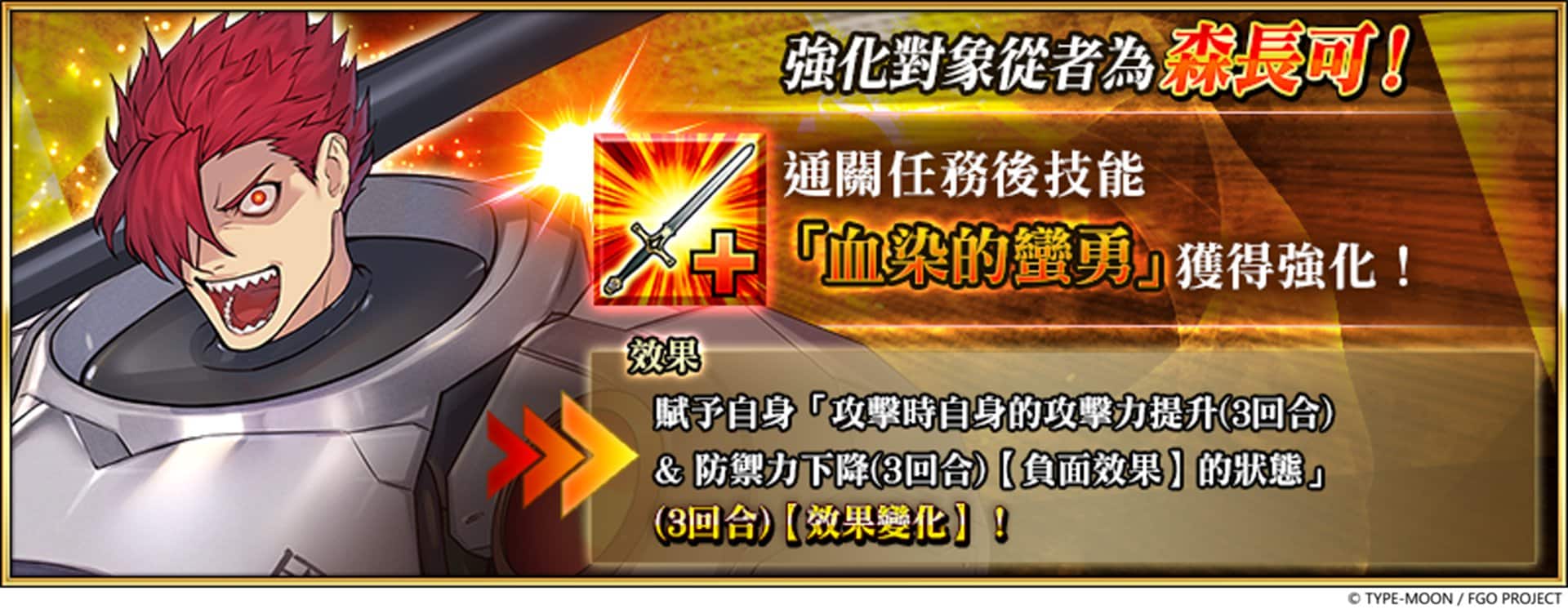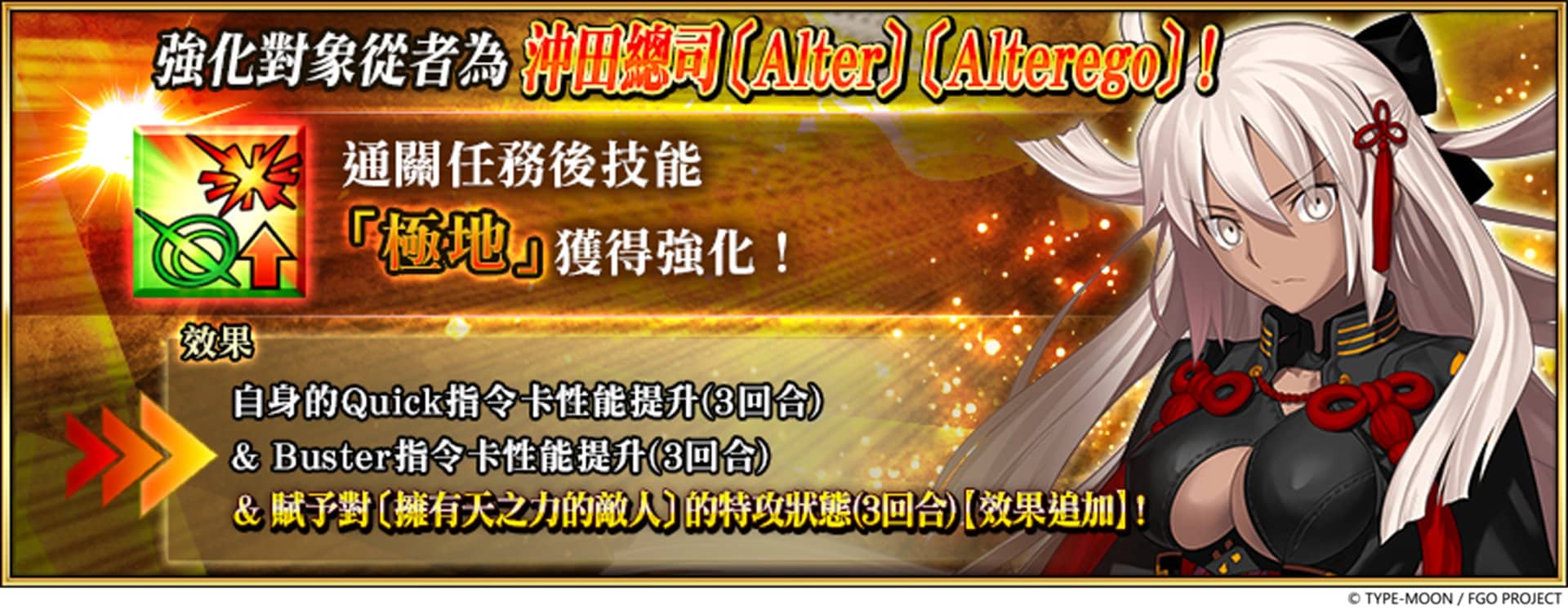 此外,自 2024 年 7 月 7 日 16:00 後起,將於迦勒底之門永久追加「★5(SSR)沖田總司〔Alter〕〔Alterego〕」及「★3(R)森長可」的特別任務「從者強化任務」,通過任務後,不僅能強化對象從者,更可獲得聖晶石獎勵。