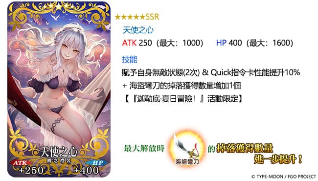 當挑戰「迦勒底.夏日冒險!~追夢少年與懷夢少女~」時,裝備「迦勒底.夏日冒險!PICK UP召喚1」實裝的「★5(SSR)天使之心」、「★4(SR)粉紅海灘」及「★3(R)叢林海盜」等三款概念禮裝,除了擁有既有的增益效果,還能有效提升機率掉落的「海盜彎刀」、「海盜啤酒杯」及「海盜頭巾」等活動道具數量。