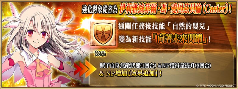 自 2023 年 6 月 20 日維修後起,將永久開放「★5(SSR)伊莉雅絲菲爾・馮・愛因茲貝倫〔Caster〕」及「★4(SR)美遊・艾蒂菲爾特」的特別任務「從者強化任務」,通過任務後,對象從者將得以強化,還能獲得聖晶石獎勵。