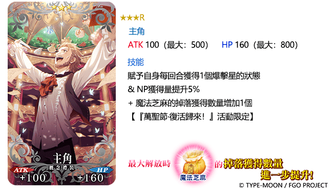而至 8 月 15 日,「萬聖節‧復活歸來! ~砂塵的女王與暗黑的使徒~」相關從者的強化任務以及幕間物語 AP 消耗量將限時降為 1/2。同時,相關從者強化時大成功、極大成功的發生率將限時上升為 2 倍;此外,選擇相關從者作為支援從者時,所獲得的友情點數也將提升為 2 倍。