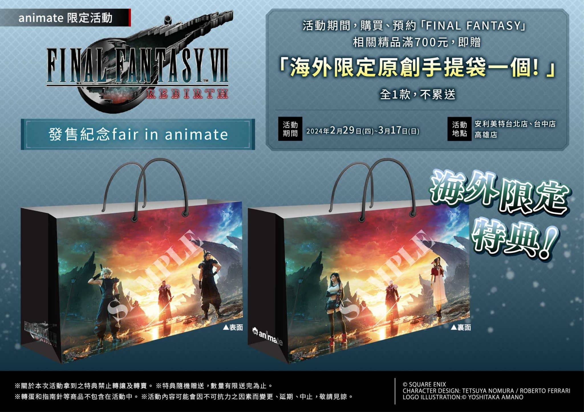 同時為慶祝《FINAL FANTASY VII REBIRTH》於 2 月 29 日發售,安利美特台北店將於 2 月 29 日至 3 月 17 日間舉辦「FINAL FANTASY VII REBIRTH 發售紀念 fair in animate」特別活動,玩家只要購買相關商品滿額即贈送限量好禮。