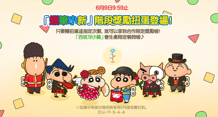 活動期間內登場的扭蛋活動中將會出現包括「西班牙小新」、「西班牙小葵」、「法國肥嘟嘟左衛門」等本次合作的限定角色。依照扭蛋的次數還可以再獲得額外獎勵裝飾,最終階段的獎勵為「瑞士小白」小夥伴。另外玩家只要在活動期間內到達等級 8 並且完成 10 趟遊戲裡的貨車任務,可以免費下載 16 張可愛貼圖。