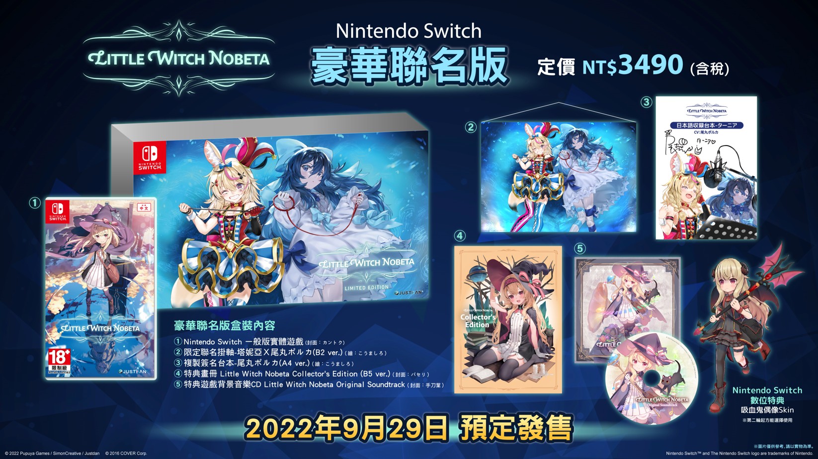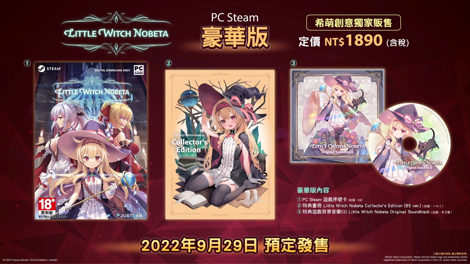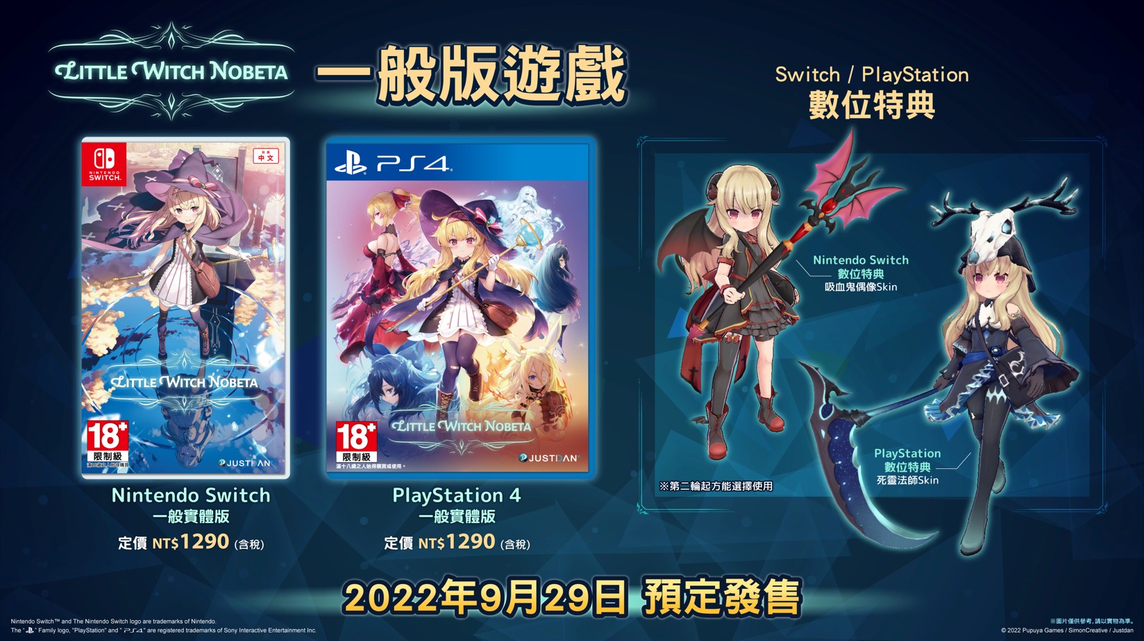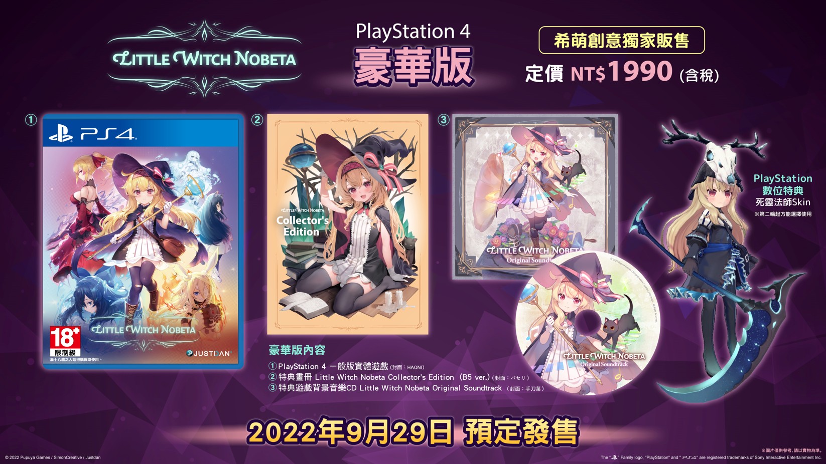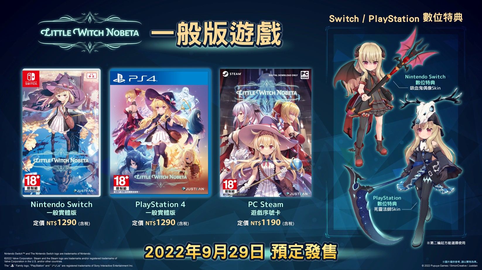 《Little Witch Nobeta》公開了正式版上線時間為 9 月 29 日,並釋出了首批數位特典、豪華特典與豪華聯名特典內容情報,並宣布即日起可開始至各大通路預訂。本作是一款 3D 動作冒險遊戲,玩家扮演的小魔女必須在古堡中挑戰強大的生魂人偶,以王座為目標解開自己的身世之謎。遊戲自 2017 年開始開發、2019 年釋出免費試玩版、2020 年釋出 STEAM 搶先體驗版。