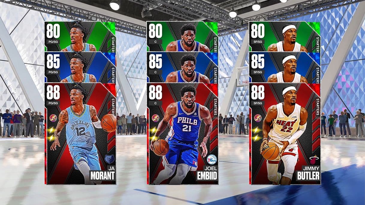 ● 先發卡片:玩家可以選擇全明星 Ja Morant、Jimmy Butler 或 Joel Embiid 來帶領他們的陣容。在最終決定之前,玩家可以先在三重威脅比賽中使用他們挑選的先發卡片。在任何 MyTEAM 模式打 10 場比賽後,玩家將獲得一張綜評 90 的紫水晶 Fred Jones 卡片來提升他們的隊伍。