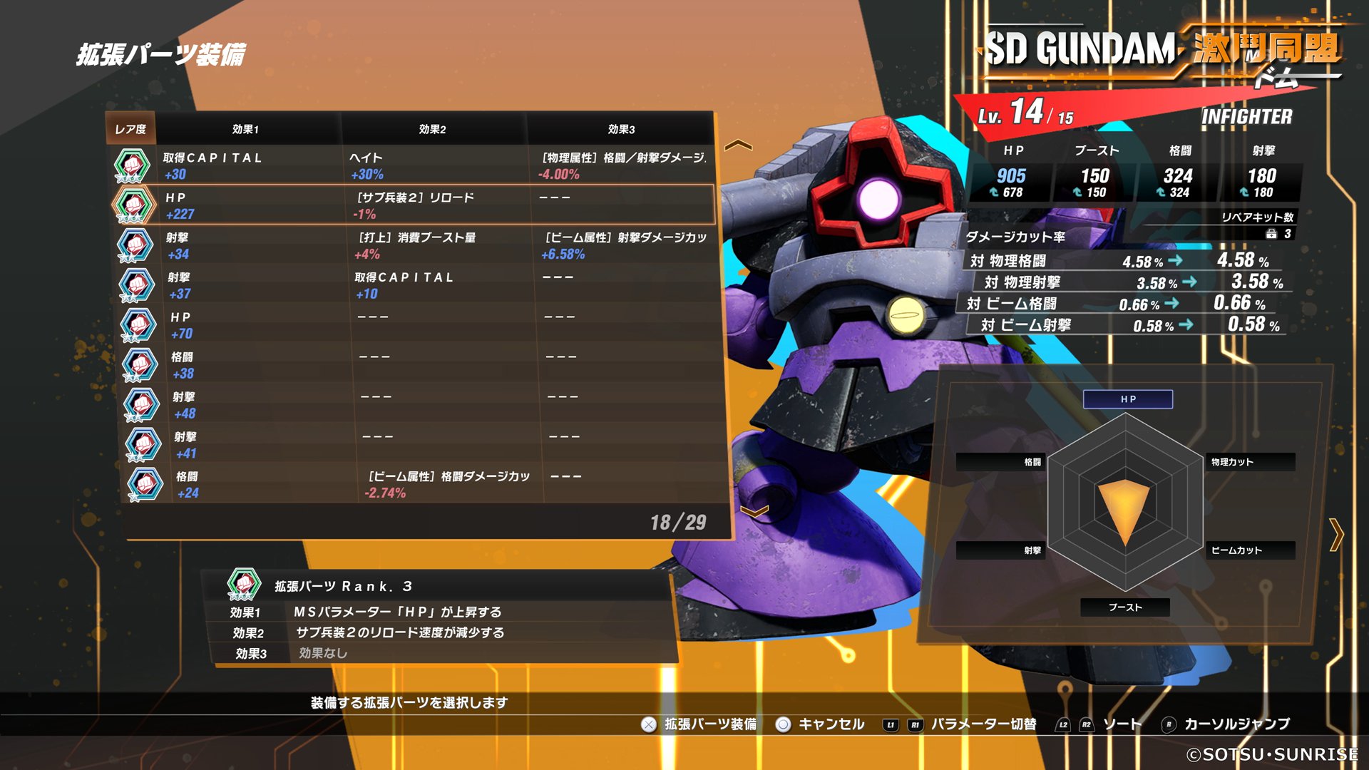 玩家可以在任務中,自敵方機體掉落的物品或貨櫃中取得可裝備於機體上的擴張零件。擴張零件擁有包含「正面效果」及「負面效果」在內的多種效果。玩家可針對較弱的能力值進行強化,並進一步凸顯機體所擁有的特徵。