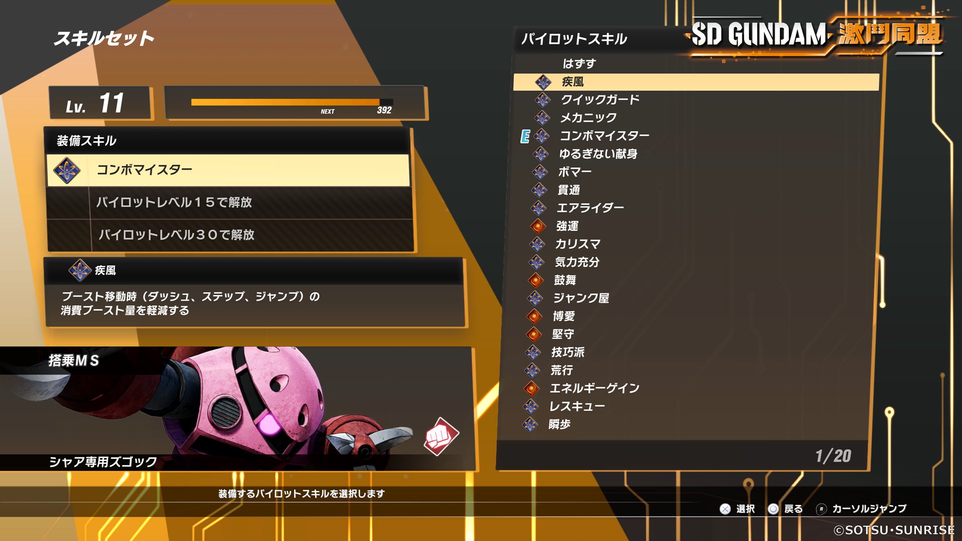 透過設定「駕駛員技能」,可以補強只憑強化機體所無法增強的部分。只要參加任務,擊破敵方機體,就可累積經驗值並提升主角的等級。等級越高,可使用的駕駛員技能也會隨之增加。玩家可靈活搭配運用 MS 強化、擴張零件及駕駛員技能,完成專屬於自己的最強 MS。