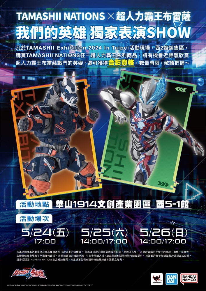 本次展出內容集結日本萬代 SPIRITS 收藏玩具事業部 TAMASHII NATIONS 旗下眾多品牌商品,《航海王》、《超人力霸王布雷薩》、《機動戰士鋼彈》、《無敵鐵金剛》、《七龍珠》、《鬼滅之刃》等多部作品也將於展區和粉絲們見面,要和擁有熱血收藏魂的粉絲們共同開啟模型收藏新世代。現場還將特別舉辦「超人力霸王 獨家表演 SHOW」,讓粉絲們一睹超人力霸王布雷薩的風采,還有機會獲得限量合影,千萬別錯過。