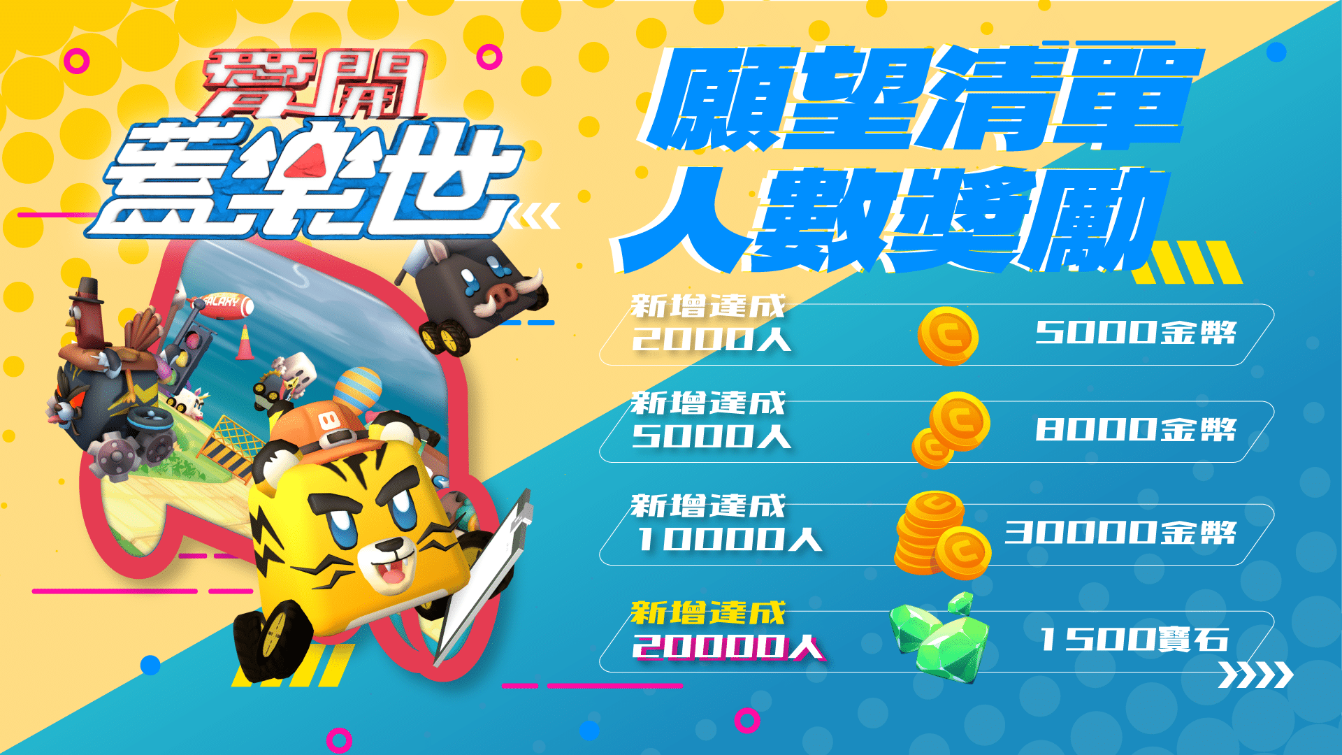 為慶祝封閉測試開啟,特別推出了「願望清單解鎖獎勵」活動。即日起,只要玩家在 Steam 上將《愛開蓋樂世》加入願望清單,達成人數目標,全服玩家將在遊戲正式上架後一週內獲得相應獎勵。