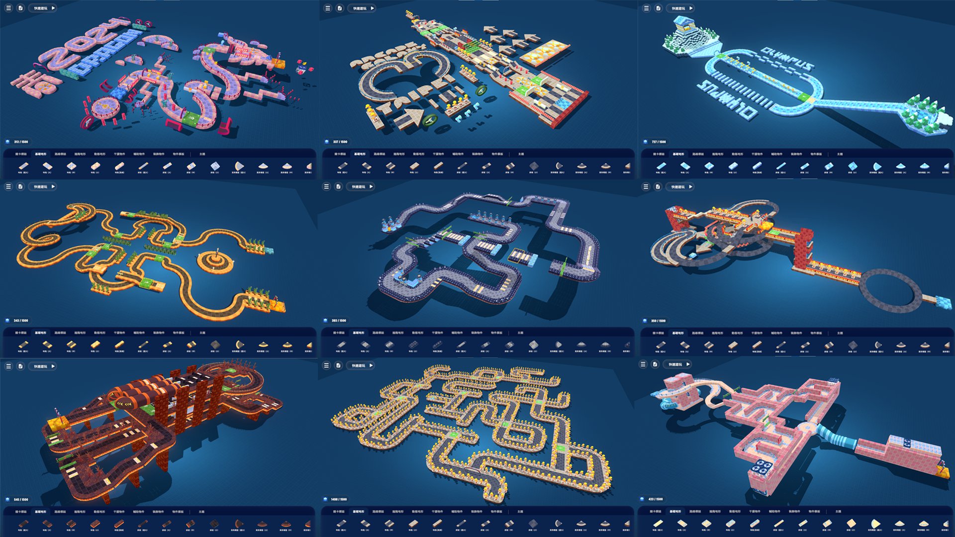 《Arcade Galaxy》最具特色之處在於其高自由度的關卡編輯器,提供九大核心功能選項:關卡標誌、基礎地形、路線標誌、進階地形、動態地形、干擾物件、輔助物件、裝飾物件以及物件模板。此外,編輯器中還內建十種多樣化的場景主題,使玩家能構建自己理想中的遊戲環境。從秋名山的經典髮夾彎道,到充滿探索與挑戰的巨大迷宮,每一個細節都能展現玩家的創造力。