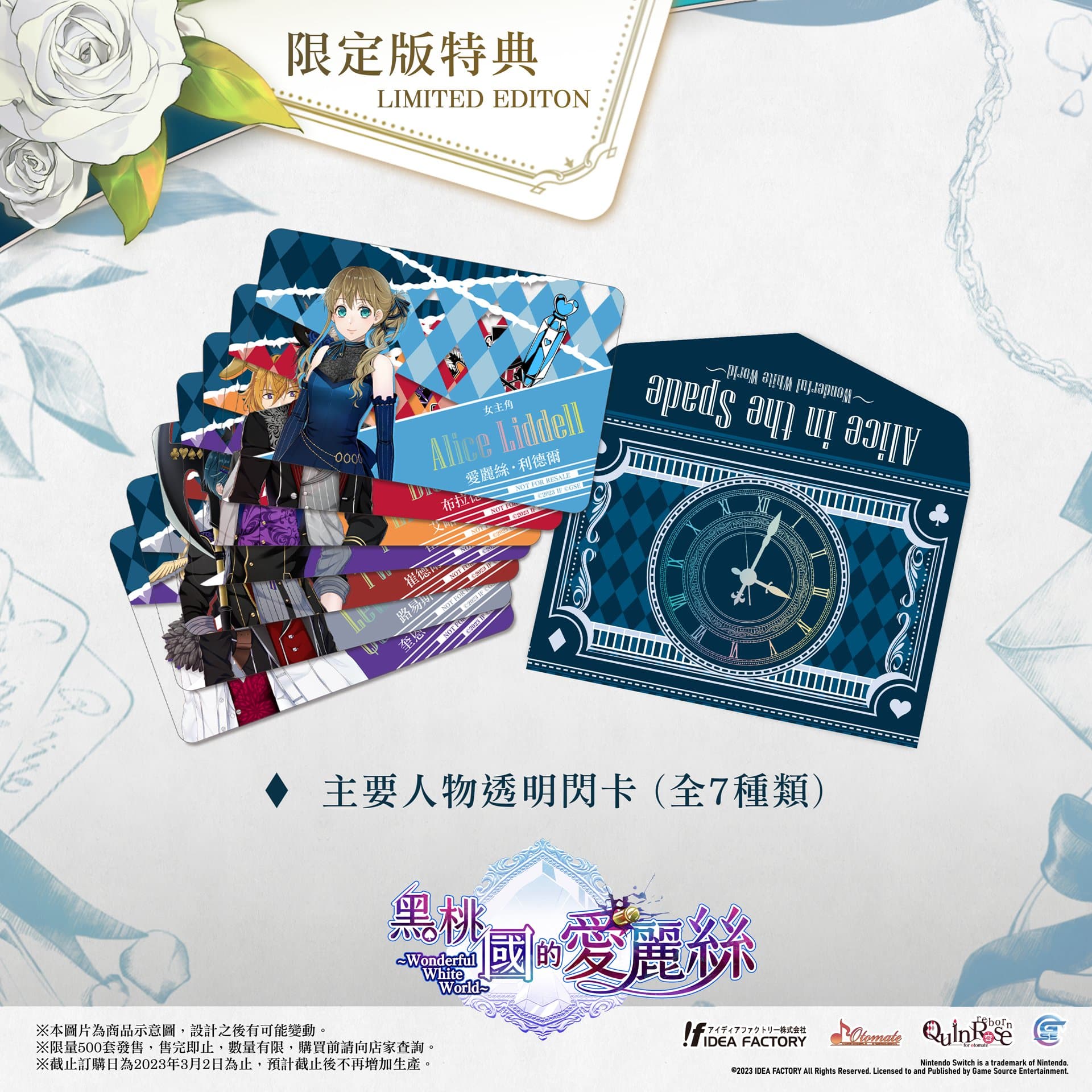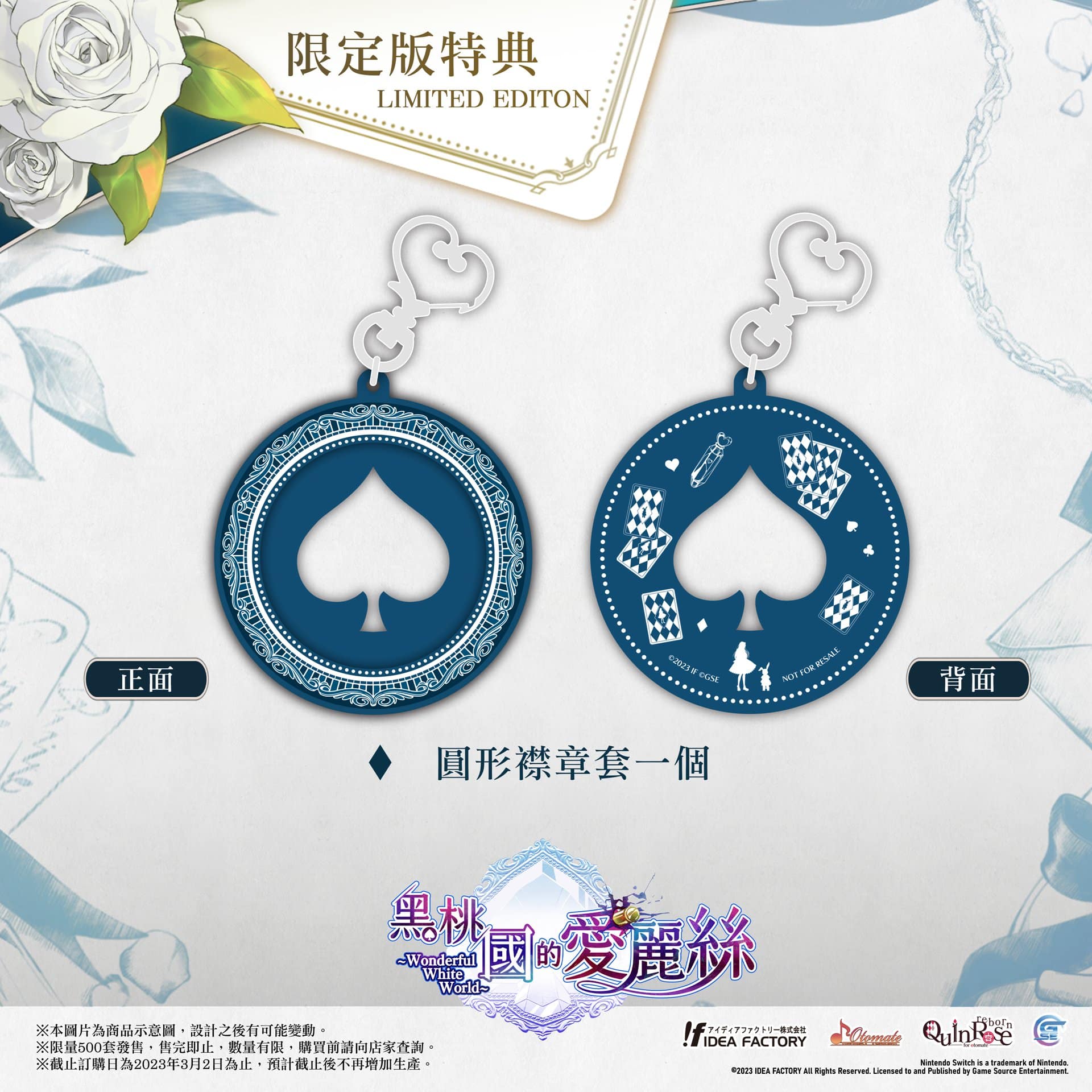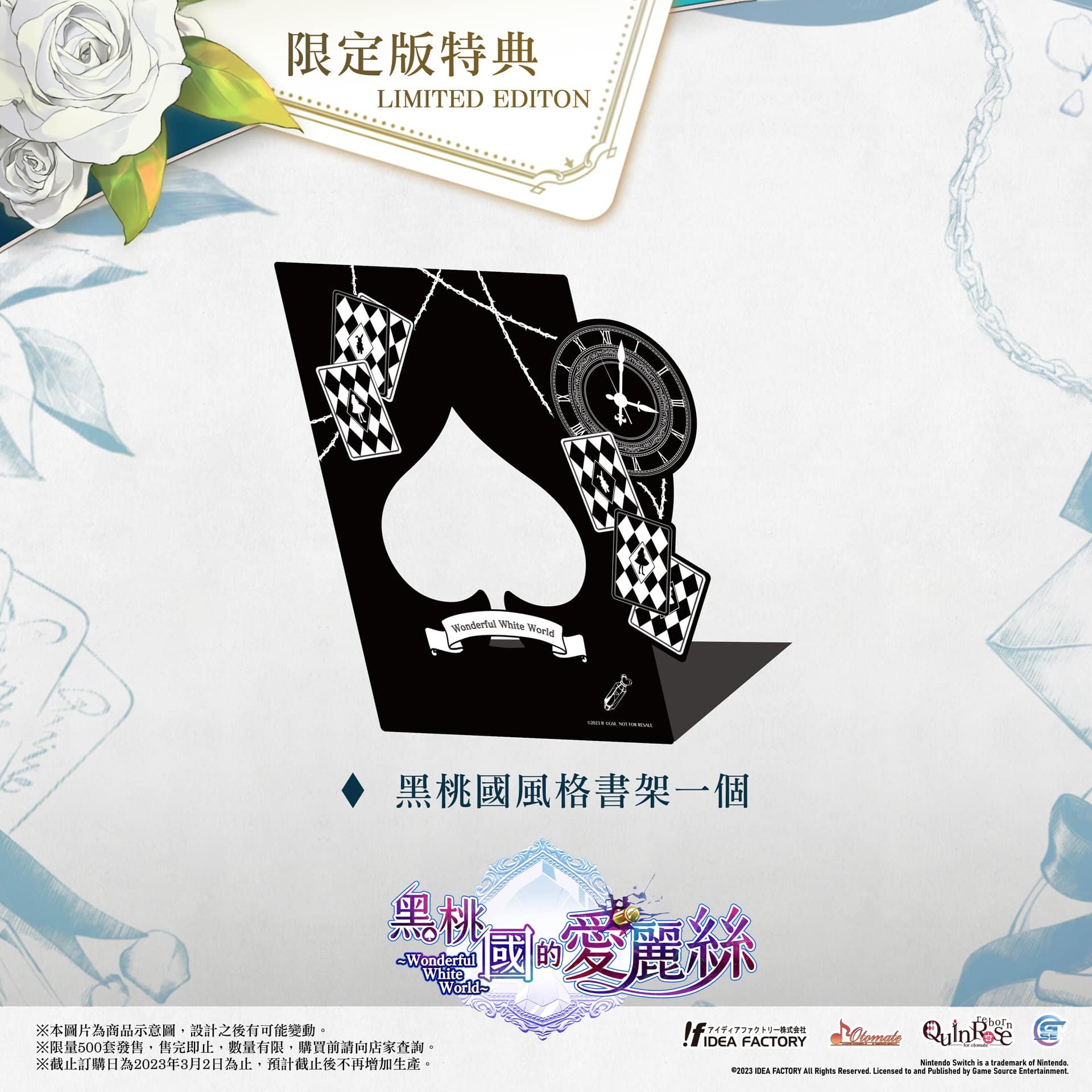 GSE 宣佈,女性向遊戲《黑桃國的愛麗絲 Wonderful White World》Nintendo Switch 亞洲繁體中文版預定於 2023 年內發售。本次公開《黑桃國的愛麗絲 Wonderful White World》的預購及限定版特典情報,本次限定版特典預計限量發售 500 套。