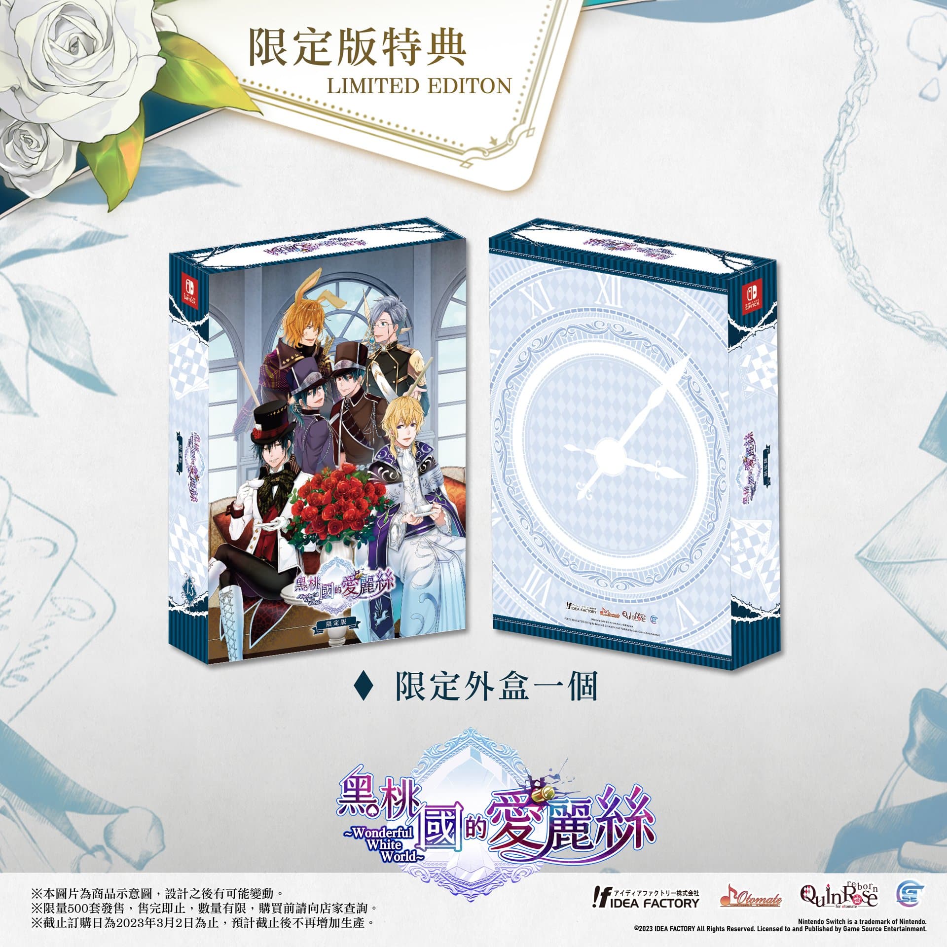 GSE 宣佈,女性向遊戲《黑桃國的愛麗絲 Wonderful White World》Nintendo Switch 亞洲繁體中文版預定於 2023 年內發售。本次公開《黑桃國的愛麗絲 Wonderful White World》的預購及限定版特典情報,本次限定版特典預計限量發售 500 套。