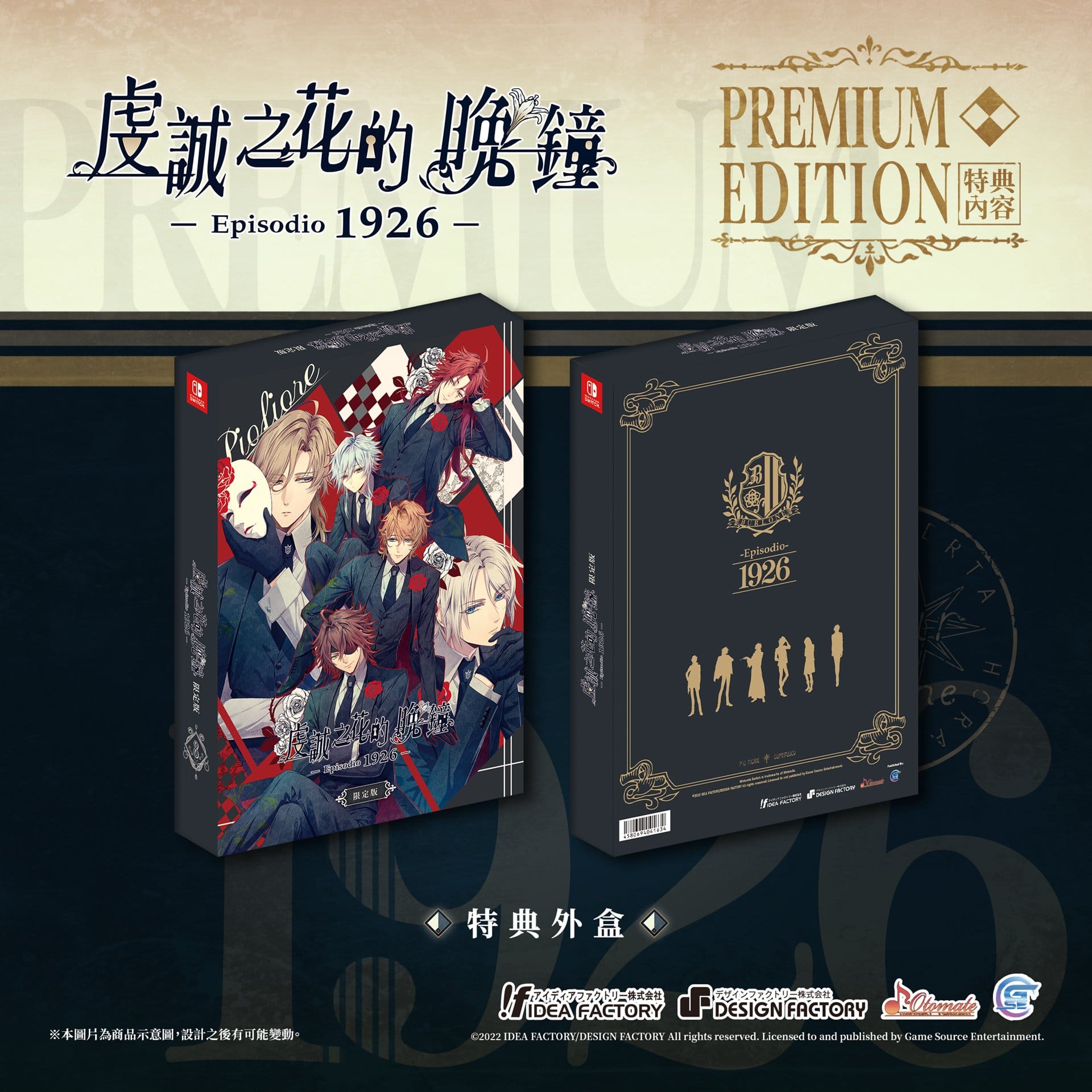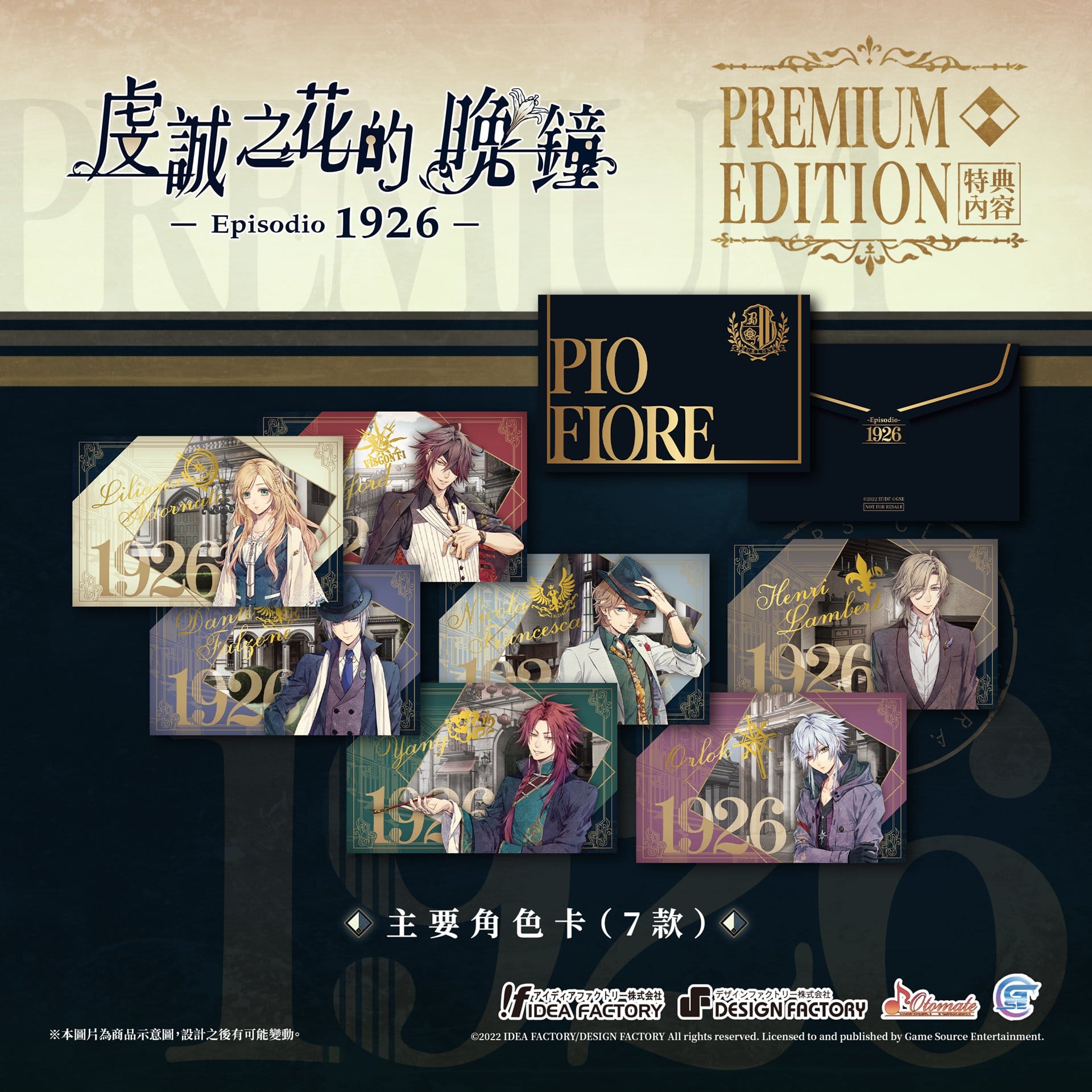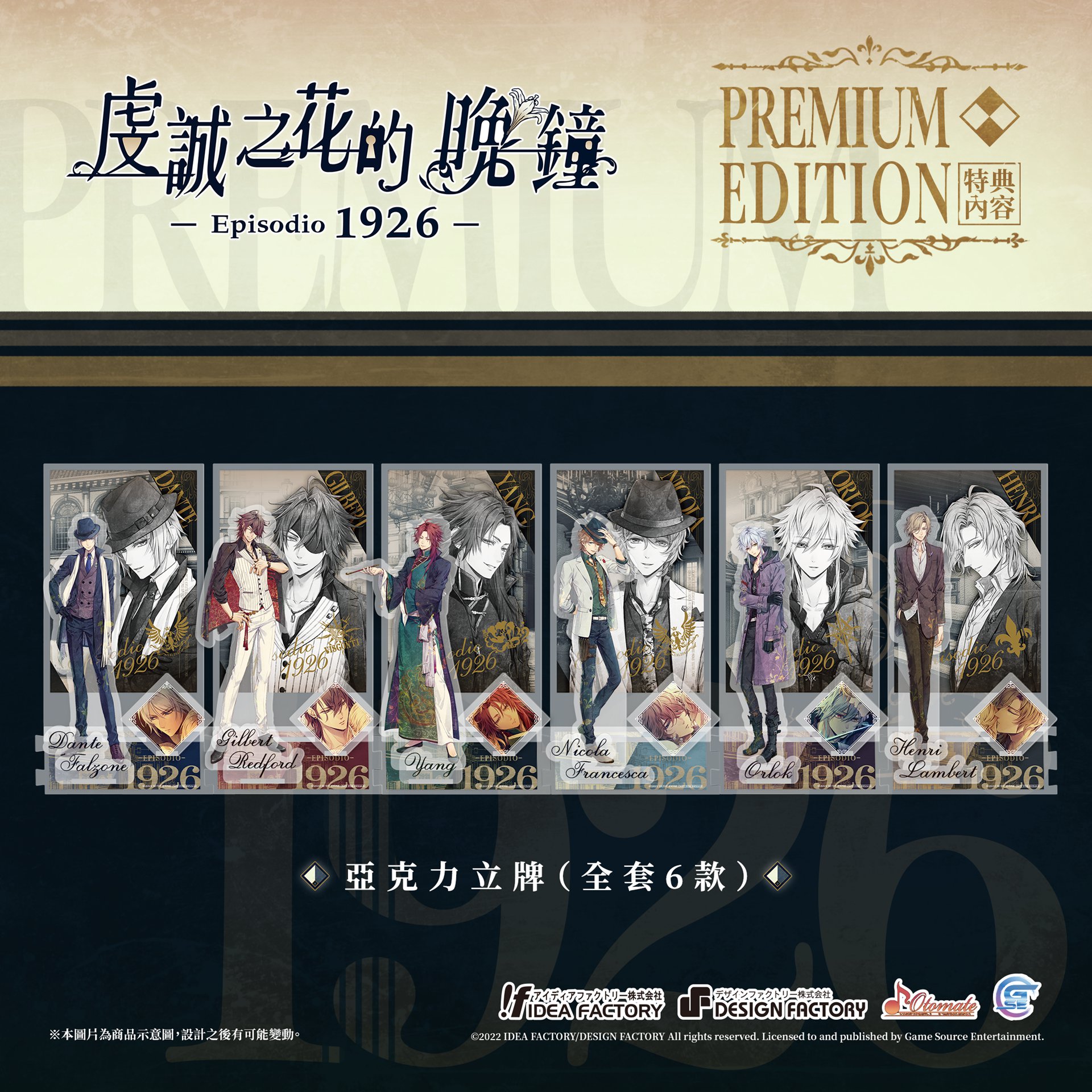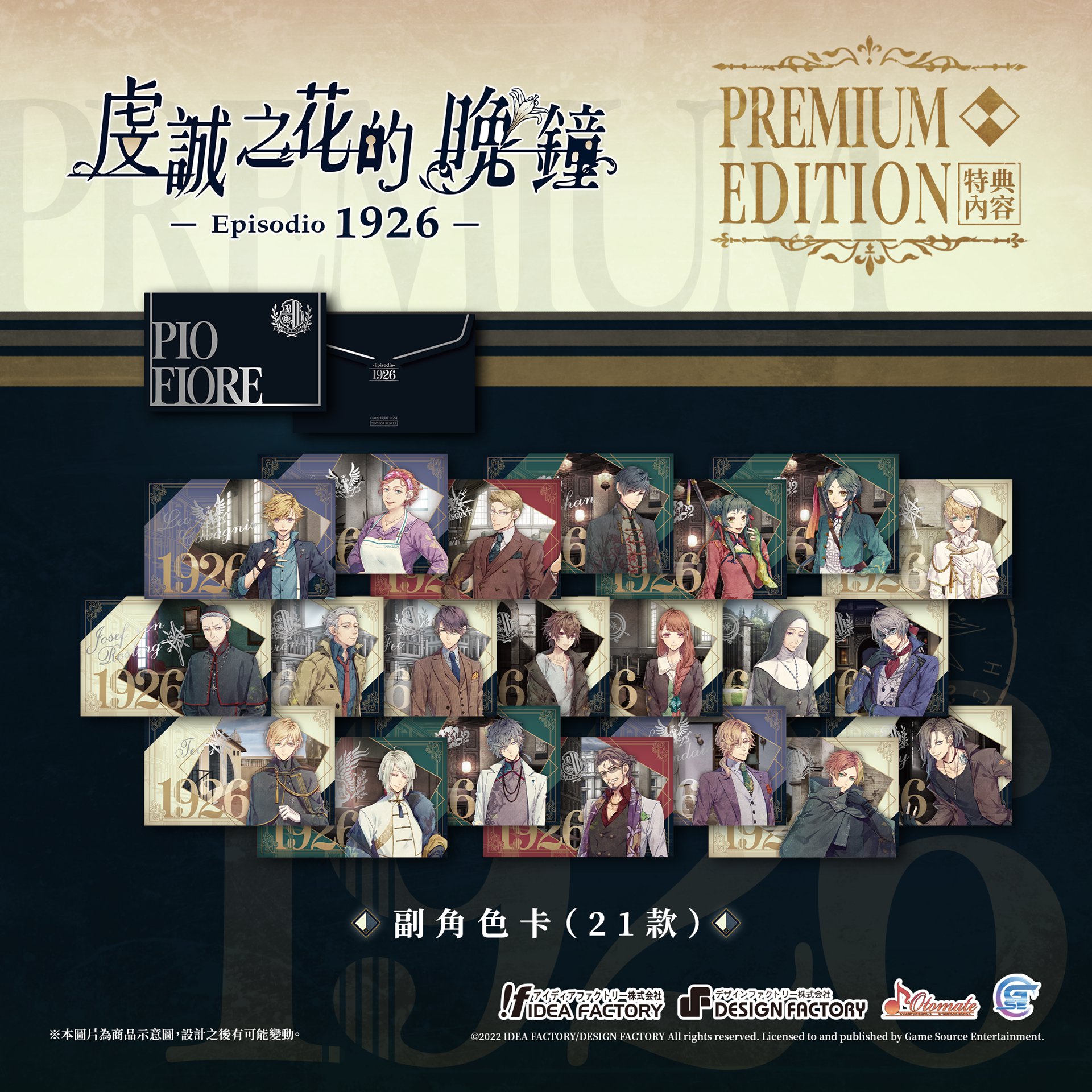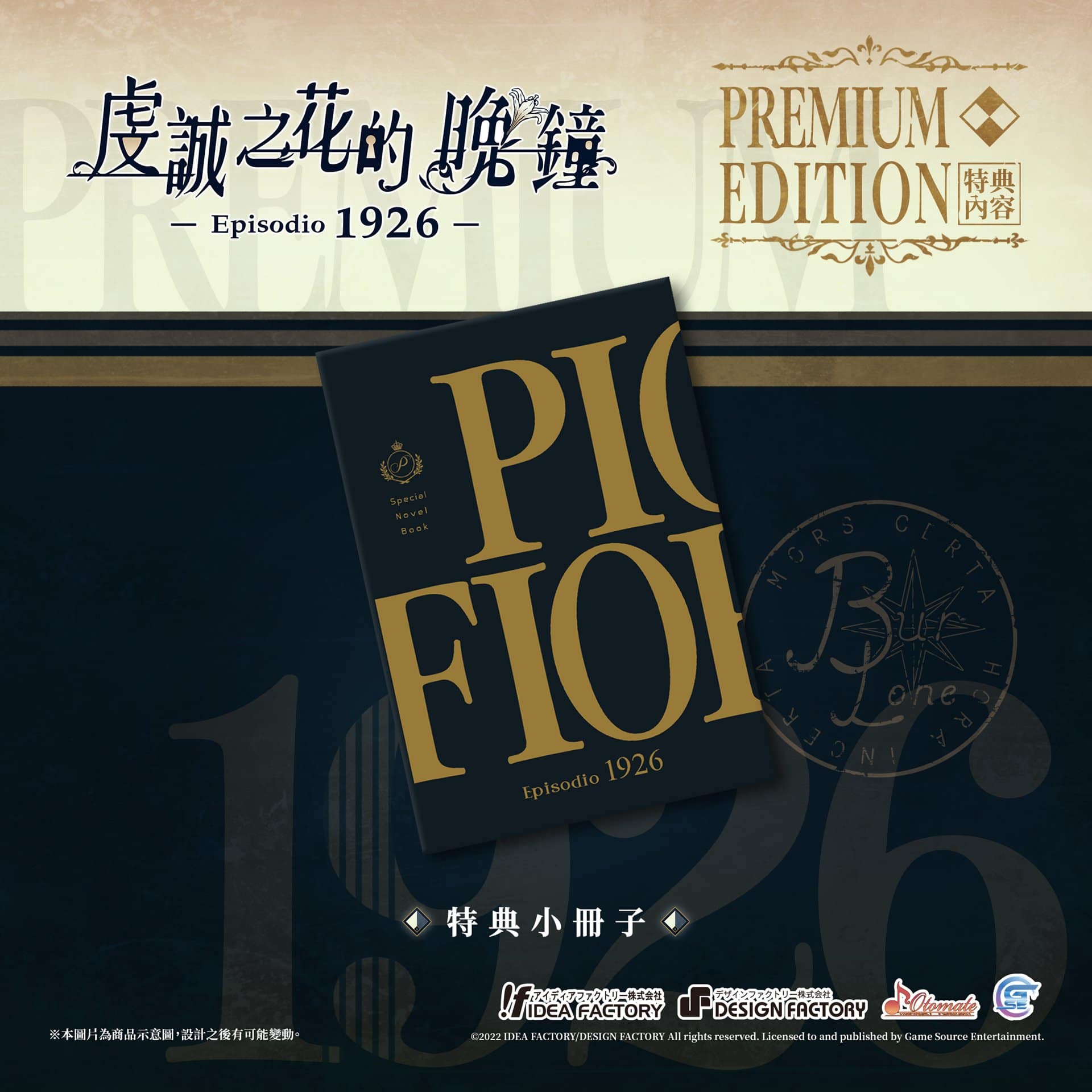 GSE 宣佈,將與日本遊戲公司「Idea Factory」旗下的乙女遊戲品牌「Otomate」合作推出乙女遊戲續作《虔誠之花的晚鐘 1926》繁體中文版。為了迎接《虔誠之花的晚鐘 1926》的到來,官方公開部份本作特典。包含預購在內的特典內容如下,