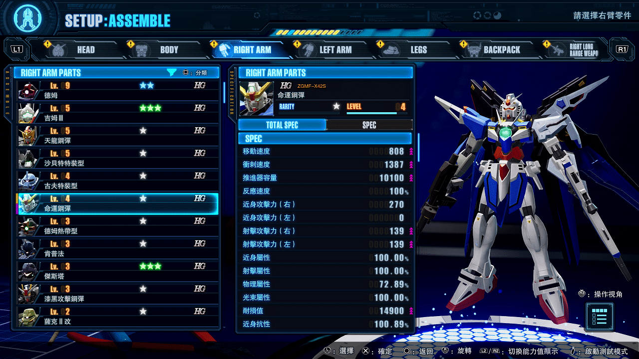 改裝進化:左右手可改裝為不同的零件或武器,在本作中,左右手可以分別設定為不同的零件,玩家將可以製作獨創性遠超過前作的獨門鋼彈模型。